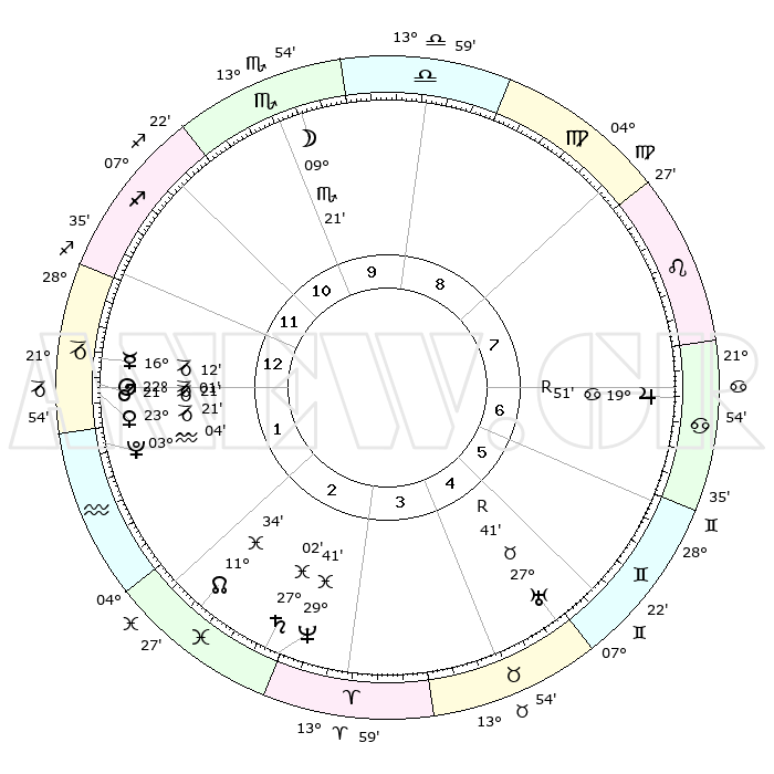 | | ΘΕΣΕΙΣ ΠΛΑΝΗΤΩΝ ΑΣΤΡΟΛΟΓΙΚΟΥ ΧΑΡΤΗ ΤΗΣ ΣΤΙΓΜΗΣ ΑΥΤΗΣ | | | | Πλανήτης | Ζώδιο | Μοίρες | Δεκαήμ. | Σε οίκο | Απόκλιση | | Ακμές των οίκων | | Ηλιος | Αιγόκερως | 21°57' | Τρίτο | 1 | 21 S 39 | | 1ος | 25°50' | Τοξότης | | Σελήνη | Σκορπιός | 08°28' | Πρώτο | 10 | 18 S 27 | | 2ος | 01°57' | Υδροχόος | | Ερμής | Αιγόκερως | 16°05' | Δεύτερο | 1 | 24 S 03 | | 3ος | 11°35' | Ιχθείς | | Αφροδίτη | Αιγόκερως | 23°16' | Τρίτο | 1 | 22 S 18 | | 4ος | 16°09' | Κριός | | Αρης | Αιγόκερως | 21°18' | Τρίτο | 1 | 22 S 42 | | 5ος | 13°08' | Ταύρος | | Δίας | Καρκίνος | 19°52'R | Δεύτερο | 7 | 22 N 14 | | 6ος | 05°15' | Δίδυμοι | | Κρόνος | Ιχθείς | 27°02' | Τρίτο | 3 | 03 S 13 | | 7ος | 25°50' | Δίδυμοι | | Ουρανός | Ταύρος | 27°41'R | Τρίτο | 5 | 19 N 27 | | 8ος | 01°57' | Λέων | | Ποσειδώνας | Ιχθείς | 29°41' | Τρίτο | 3 | 01 S 21 | | 9ος | 11°35' | Παρθένος | | Πλούτωνας | Υδροχόος | 03°04' | Πρώτο | 2 | 23 S 09 | | 10ος | 16°09' | Ζυγός | | Β. Δεσμός | Ιχθείς | 11°35' | Δεύτερο | 2 | 07 S 13 | | 11ος | 13°08' | Σκορπιός | | Ωροσκόπος | Τοξότης | 25°50' | Τρίτο | | | 12ος | 05°15' | Τοξότης | | Μεσουράνημα | Ζυγός | 16°09' | Δεύτερο | | | |