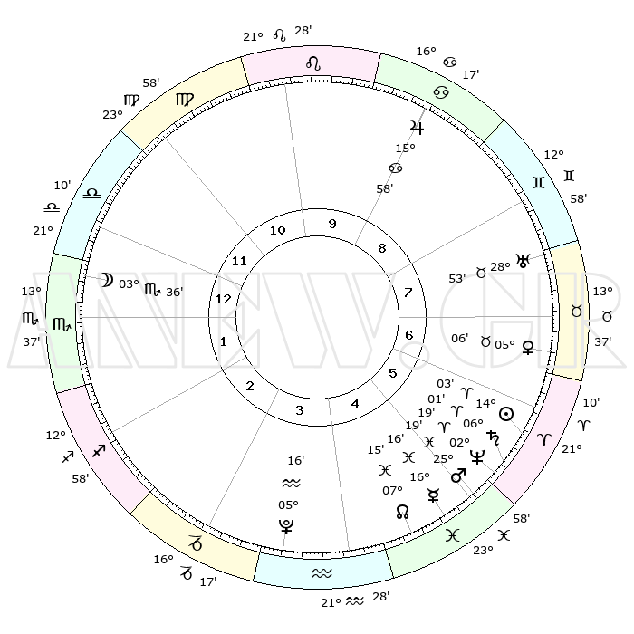 | | ΘΕΣΕΙΣ ΠΛΑΝΗΤΩΝ ΑΣΤΡΟΛΟΓΙΚΟΥ ΧΑΡΤΗ ΤΗΣ ΣΤΙΓΜΗΣ ΑΥΤΗΣ | | | | Πλανήτης | Ζώδιο | Μοίρες | Δεκαήμ. | Σε οίκο | Απόκλιση | | Ακμές των οίκων | | Ηλιος | Κριός | 13°58' | Δεύτερο | 6 | 05 N 30 | | 1ος | 20°60' | Ζυγός | | Σελήνη | Σκορπιός | 02°39' | Πρώτο | 1 | 16 S 19 | | 2ος | 18°54' | Σκορπιός | | Ερμής | Ιχθείς | 16°12' | Δεύτερο | 5 | 07 S 00 | | 3ος | 20°15' | Τοξότης | | Αφροδίτη | Ταύρος | 05°00' | Πρώτο | 7 | 12 N 53 | | 4ος | 23°53' | Αιγόκερως | | Αρης | Ιχθείς | 25°15' | Τρίτο | 5 | 02 S 50 | | 5ος | 26°50' | Υδροχόος | | Δίας | Καρκίνος | 15°58' | Δεύτερο | 9 | 22 N 51 | | 6ος | 26°13' | Ιχθείς | | Κρόνος | Κριός | 06°00' | Πρώτο | 6 | 00 N 26 | | 7ος | 20°60' | Κριός | | Ουρανός | Ταύρος | 28°53' | Τρίτο | 8 | 19 N 44 | | 8ος | 18°54' | Ταύρος | | Ποσειδώνας | Κριός | 02°19' | Πρώτο | 6 | 00 S 17 | | 9ος | 20°15' | Δίδυμοι | | Πλούτωνας | Υδροχόος | 05°16' | Πρώτο | 4 | 22 S 47 | | 10ος | 23°53' | Καρκίνος | | Β. Δεσμός | Ιχθείς | 07°16' | Πρώτο | 5 | 08 S 51 | | 11ος | 26°50' | Λέων | | Ωροσκόπος | Ζυγός | 20°60' | Τρίτο | | | 12ος | 26°13' | Παρθένος | | Μεσουράνημα | Καρκίνος | 23°53' | Τρίτο | | | |