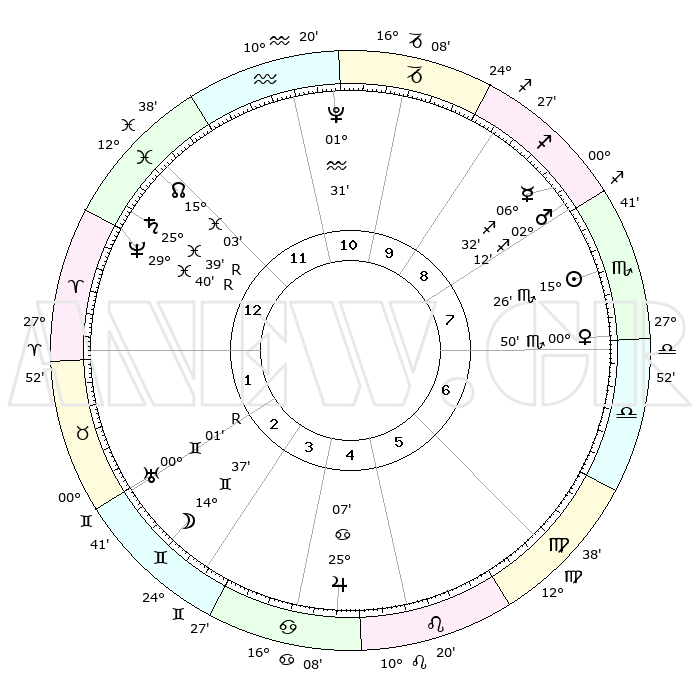 | | ΘΕΣΕΙΣ ΠΛΑΝΗΤΩΝ ΑΣΤΡΟΛΟΓΙΚΟΥ ΧΑΡΤΗ ΤΗΣ ΣΤΙΓΜΗΣ ΑΥΤΗΣ | | | | Πλανήτης | Ζώδιο | Μοίρες | Δεκαήμ. | Σε οίκο | Απόκλιση | | Ακμές των οίκων | | Ηλιος | Σκορπιός | 15°15' | Δεύτερο | 10 | 16 S 24 | | 1ος | 22°02' | Αιγόκερως | | Σελήνη | Δίδυμοι | 11°51' | Δεύτερο | 5 | 27 N 13 | | 2ος | 04°37' | Ιχθείς | | Ερμής | Τοξότης | 06°28' | Πρώτο | 10 | 23 S 59 | | 3ος | 14°08' | Κριός | | Αφροδίτη | Σκορπιός | 00°36' | Πρώτο | 9 | 10 S 24 | | 4ος | 14°02' | Ταύρος | | Αρης | Τοξότης | 02°04' | Πρώτο | 10 | 21 S 01 | | 5ος | 07°28' | Δίδυμοι | | Δίας | Καρκίνος | 25°07' | Τρίτο | 7 | 21 N 12 | | 6ος | 28°42' | Δίδυμοι | | Κρόνος | Ιχθείς | 25°40'R | Τρίτο | 2 | 03 S 58 | | 7ος | 22°02' | Καρκίνος | | Ουρανός | Δίδυμοι | 00°01'R | Πρώτο | 4 | 19 N 57 | | 8ος | 04°37' | Παρθένος | | Ποσειδώνας | Ιχθείς | 29°40'R | Τρίτο | 2 | 01 S 23 | | 9ος | 14°08' | Ζυγός | | Πλούτωνας | Υδροχόος | 01°31' | Πρώτο | 1 | 23 S 30 | | 10ος | 14°02' | Σκορπιός | | Β. Δεσμός | Ιχθείς | 15°04' | Δεύτερο | 2 | 05 S 53 | | 11ος | 07°28' | Τοξότης | | Ωροσκόπος | Αιγόκερως | 22°02' | Τρίτο | | | 12ος | 28°42' | Τοξότης | | Μεσουράνημα | Σκορπιός | 14°02' | Δεύτερο | | | |