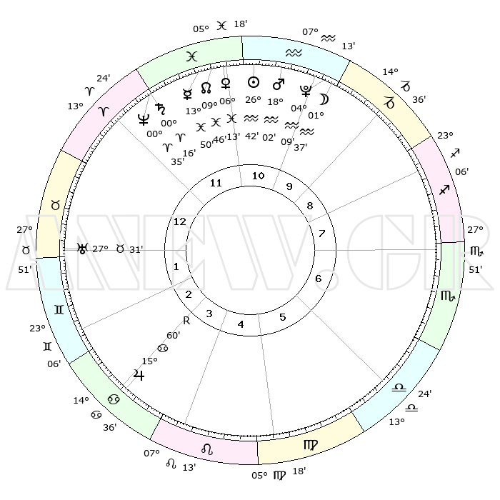 | | ΘΕΣΕΙΣ ΠΛΑΝΗΤΩΝ ΑΣΤΡΟΛΟΓΙΚΟΥ ΧΑΡΤΗ ΤΗΣ ΣΤΙΓΜΗΣ ΑΥΤΗΣ | | | | Πλανήτης | Ζώδιο | Μοίρες | Δεκαήμ. | Σε οίκο | Απόκλιση | | Ακμές των οίκων | | Ηλιος | Υδροχόος | 26°39' | Τρίτο | 11 | 12 S 38 | | 1ος | 28°41' | Κριός | | Σελήνη | Υδροχόος | 00°52' | Πρώτο | 10 | 23 S 08 | | 2ος | 01°16' | Δίδυμοι | | Ερμής | Ιχθείς | 13°45' | Δεύτερο | 12 | 06 S 17 | | 3ος | 24°58' | Δίδυμοι | | Αφροδίτη | Ιχθείς | 06°09' | Πρώτο | 11 | 10 S 37 | | 4ος | 16°39' | Καρκίνος | | Αρης | Υδροχόος | 17°59' | Δεύτερο | 11 | 16 S 28 | | 5ος | 10°55' | Λέων | | Δίας | Καρκίνος | 16°00'R | Δεύτερο | 3 | 22 N 48 | | 6ος | 13°23' | Παρθένος | | Κρόνος | Κριός | 00°16' | Πρώτο | 12 | 01 S 52 | | 7ος | 28°41' | Ζυγός | | Ουρανός | Ταύρος | 27°31' | Τρίτο | 1 | 19 N 25 | | 8ος | 01°16' | Τοξότης | | Ποσειδώνας | Κριός | 00°35' | Πρώτο | 12 | 00 S 58 | | 9ος | 24°58' | Τοξότης | | Πλούτωνας | Υδροχόος | 04°09' | Πρώτο | 10 | 22 S 56 | | 10ος | 16°39' | Αιγόκερως | | Β. Δεσμός | Ιχθείς | 09°46' | Πρώτο | 11 | 07 S 54 | | 11ος | 10°55' | Υδροχόος | | Ωροσκόπος | Κριός | 28°41' | Τρίτο | | | 12ος | 13°23' | Ιχθείς | | Μεσουράνημα | Αιγόκερως | 16°39' | Δεύτερο | | | |