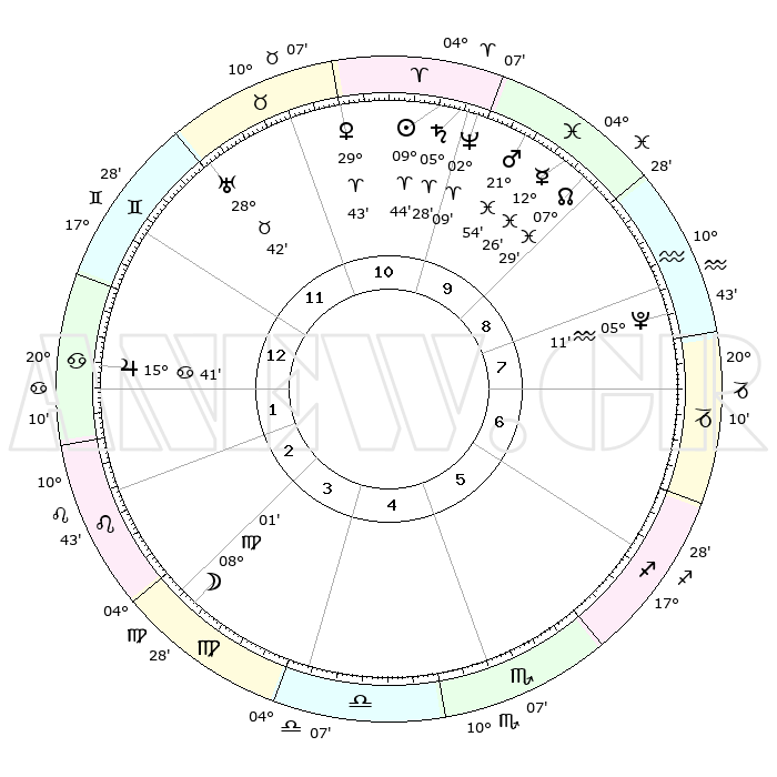 | | ΘΕΣΕΙΣ ΠΛΑΝΗΤΩΝ ΑΣΤΡΟΛΟΓΙΚΟΥ ΧΑΡΤΗ ΤΗΣ ΣΤΙΓΜΗΣ ΑΥΤΗΣ | | | | Πλανήτης | Ζώδιο | Μοίρες | Δεκαήμ. | Σε οίκο | Απόκλιση | | Ακμές των οίκων | | Ηλιος | Κριός | 09°38' | Πρώτο | 11 | 03 N 49 | | 1ος | 20°55' | Δίδυμοι | | Σελήνη | Παρθένος | 06°49' | Πρώτο | 4 | 09 N 10 | | 2ος | 12°28' | Καρκίνος | | Ερμής | Ιχθείς | 12°22' | Δεύτερο | 10 | 07 S 52 | | 3ος | 03°50' | Λέων | | Αφροδίτη | Κριός | 29°36' | Τρίτο | 11 | 10 N 51 | | 4ος | 28°48' | Λέων | | Αρης | Ιχθείς | 21°49' | Τρίτο | 10 | 04 S 12 | | 5ος | 01°09' | Ζυγός | | Δίας | Καρκίνος | 15°41' | Δεύτερο | 2 | 22 N 53 | | 6ος | 11°27' | Σκορπιός | | Κρόνος | Κριός | 05°27' | Πρώτο | 11 | 00 N 13 | | 7ος | 20°55' | Τοξότης | | Ουρανός | Ταύρος | 28°42' | Τρίτο | 12 | 19 N 42 | | 8ος | 12°28' | Αιγόκερως | | Ποσειδώνας | Κριός | 02°09' | Πρώτο | 11 | 00 S 21 | | 9ος | 03°50' | Υδροχόος | | Πλούτωνας | Υδροχόος | 05°11' | Πρώτο | 9 | 22 S 48 | | 10ος | 28°48' | Υδροχόος | | Β. Δεσμός | Ιχθείς | 07°30' | Πρώτο | 10 | 08 S 45 | | 11ος | 01°09' | Κριός | | Ωροσκόπος | Δίδυμοι | 20°55' | Τρίτο | | | 12ος | 11°27' | Ταύρος | | Μεσουράνημα | Υδροχόος | 28°48' | Τρίτο | | | |