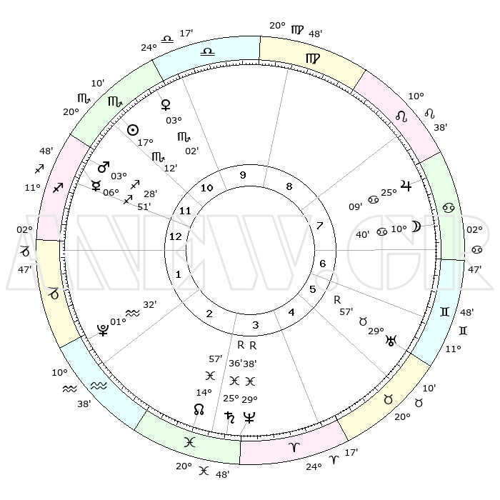 | | ΘΕΣΕΙΣ ΠΛΑΝΗΤΩΝ ΑΣΤΡΟΛΟΓΙΚΟΥ ΧΑΡΤΗ ΤΗΣ ΣΤΙΓΜΗΣ ΑΥΤΗΣ | | | | Πλανήτης | Ζώδιο | Μοίρες | Δεκαήμ. | Σε οίκο | Απόκλιση | | Ακμές των οίκων | | Ηλιος | Σκορπιός | 17°08' | Δεύτερο | 11 | 16 S 57 | | 1ος | 09°35' | Τοξότης | | Σελήνη | Καρκίνος | 09°36' | Πρώτο | 7 | 27 N 44 | | 2ος | 12°13' | Αιγόκερως | | Ερμής | Τοξότης | 06°51' | Πρώτο | 12 | 23 S 50 | | 3ος | 19°33' | Υδροχόος | | Αφροδίτη | Σκορπιός | 02°57' | Πρώτο | 11 | 11 S 14 | | 4ος | 25°33' | Ιχθείς | | Αρης | Τοξότης | 03°25' | Πρώτο | 12 | 21 S 18 | | 5ος | 25°14' | Κριός | | Δίας | Καρκίνος | 25°09' | Τρίτο | 8 | 21 N 12 | | 6ος | 19°01' | Ταύρος | | Κρόνος | Ιχθείς | 25°36'R | Τρίτο | 4 | 03 S 59 | | 7ος | 09°35' | Δίδυμοι | | Ουρανός | Ταύρος | 29°57'R | Τρίτο | 6 | 19 N 56 | | 8ος | 12°13' | Καρκίνος | | Ποσειδώνας | Ιχθείς | 29°38'R | Τρίτο | 4 | 01 S 24 | | 9ος | 19°33' | Λέων | | Πλούτωνας | Υδροχόος | 01°32' | Πρώτο | 2 | 23 S 29 | | 10ος | 25°33' | Παρθένος | | Β. Δεσμός | Ιχθείς | 14°58' | Δεύτερο | 3 | 05 S 55 | | 11ος | 25°14' | Ζυγός | | Ωροσκόπος | Τοξότης | 09°35' | Πρώτο | | | 12ος | 19°01' | Σκορπιός | | Μεσουράνημα | Παρθένος | 25°33' | Τρίτο | | | |