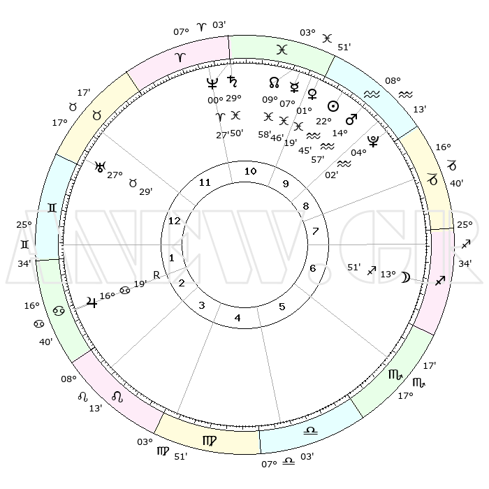 | | ΘΕΣΕΙΣ ΠΛΑΝΗΤΩΝ ΑΣΤΡΟΛΟΓΙΚΟΥ ΧΑΡΤΗ ΤΗΣ ΣΤΙΓΜΗΣ ΑΥΤΗΣ | | | | Πλανήτης | Ζώδιο | Μοίρες | Δεκαήμ. | Σε οίκο | Απόκλιση | | Ακμές των οίκων | | Ηλιος | Υδροχόος | 22°41' | Τρίτο | 10 | 13 S 57 | | 1ος | 00°01' | Δίδυμοι | | Σελήνη | Τοξότης | 13°03' | Δεύτερο | 7 | 27 S 34 | | 2ος | 24°49' | Δίδυμοι | | Ερμής | Ιχθείς | 07°39' | Πρώτο | 11 | 09 S 19 | | 3ος | 16°14' | Καρκίνος | | Αφροδίτη | Ιχθείς | 01°14' | Πρώτο | 10 | 12 S 24 | | 4ος | 09°00' | Λέων | | Αρης | Υδροχόος | 14°54' | Δεύτερο | 10 | 17 S 23 | | 5ος | 07°28' | Παρθένος | | Δίας | Καρκίνος | 16°19'R | Δεύτερο | 3 | 22 N 45 | | 6ος | 15°55' | Ζυγός | | Κρόνος | Ιχθείς | 29°50' | Τρίτο | 11 | 02 S 03 | | 7ος | 00°01' | Τοξότης | | Ουρανός | Ταύρος | 27°29' | Τρίτο | 12 | 19 N 25 | | 8ος | 24°49' | Τοξότης | | Ποσειδώνας | Κριός | 00°27' | Πρώτο | 11 | 01 S 01 | | 9ος | 16°14' | Αιγόκερως | | Πλούτωνας | Υδροχόος | 04°02' | Πρώτο | 9 | 22 S 58 | | 10ος | 09°00' | Υδροχόος | | Β. Δεσμός | Ιχθείς | 09°59' | Πρώτο | 11 | 07 S 50 | | 11ος | 07°28' | Ιχθείς | | Ωροσκόπος | Δίδυμοι | 00°01' | Πρώτο | | | 12ος | 15°55' | Κριός | | Μεσουράνημα | Υδροχόος | 09°00' | Πρώτο | | | |