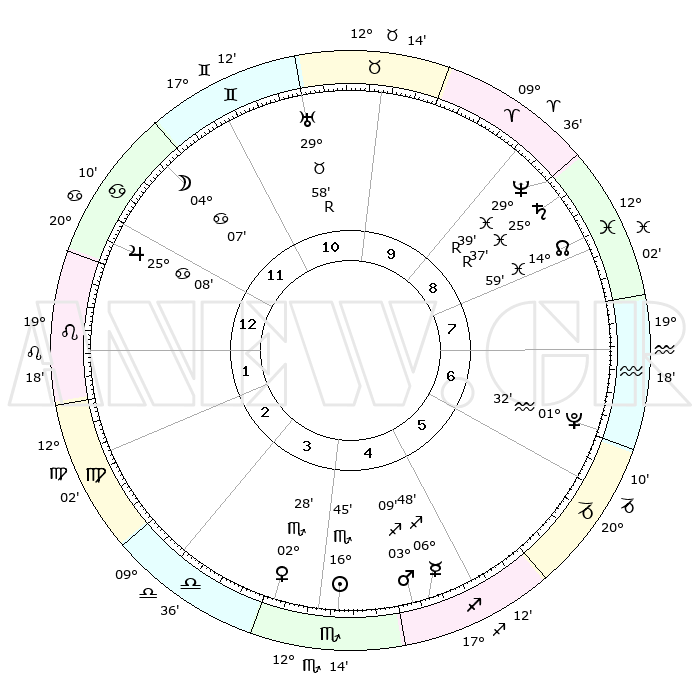 | | ΘΕΣΕΙΣ ΠΛΑΝΗΤΩΝ ΑΣΤΡΟΛΟΓΙΚΟΥ ΧΑΡΤΗ ΤΗΣ ΣΤΙΓΜΗΣ ΑΥΤΗΣ | | | | Πλανήτης | Ζώδιο | Μοίρες | Δεκαήμ. | Σε οίκο | Απόκλιση | | Ακμές των οίκων | | Ηλιος | Σκορπιός | 16°39' | Δεύτερο | 5 | 16 S 48 | | 1ος | 20°19' | Καρκίνος | | Σελήνη | Καρκίνος | 02°39' | Πρώτο | 12 | 28 N 17 | | 2ος | 10°52' | Λέων | | Ερμής | Τοξότης | 06°48' | Πρώτο | 5 | 23 S 53 | | 3ος | 04°38' | Παρθένος | | Αφροδίτη | Σκορπιός | 02°21' | Πρώτο | 4 | 11 S 01 | | 4ος | 04°18' | Ζυγός | | Αρης | Τοξότης | 03°05' | Πρώτο | 5 | 21 S 14 | | 5ος | 10°18' | Σκορπιός | | Δίας | Καρκίνος | 25°08' | Τρίτο | 1 | 21 N 12 | | 6ος | 17°38' | Τοξότης | | Κρόνος | Ιχθείς | 25°37'R | Τρίτο | 9 | 03 S 59 | | 7ος | 20°19' | Αιγόκερως | | Ουρανός | Ταύρος | 29°58'R | Τρίτο | 11 | 19 N 56 | | 8ος | 10°52' | Υδροχόος | | Ποσειδώνας | Ιχθείς | 29°39'R | Τρίτο | 9 | 01 S 24 | | 9ος | 04°38' | Ιχθείς | | Πλούτωνας | Υδροχόος | 01°32' | Πρώτο | 7 | 23 S 29 | | 10ος | 04°18' | Κριός | | Β. Δεσμός | Ιχθείς | 14°59' | Δεύτερο | 9 | 05 S 55 | | 11ος | 10°18' | Ταύρος | | Ωροσκόπος | Καρκίνος | 20°19' | Τρίτο | | | 12ος | 17°38' | Δίδυμοι | | Μεσουράνημα | Κριός | 04°18' | Πρώτο | | | |