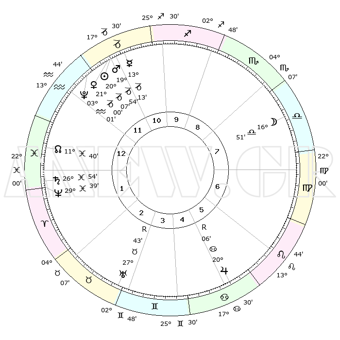 | | ΘΕΣΕΙΣ ΠΛΑΝΗΤΩΝ ΑΣΤΡΟΛΟΓΙΚΟΥ ΧΑΡΤΗ ΤΗΣ ΣΤΙΓΜΗΣ ΑΥΤΗΣ | | | | Πλανήτης | Ζώδιο | Μοίρες | Δεκαήμ. | Σε οίκο | Απόκλιση | | Ακμές των οίκων | | Ηλιος | Αιγόκερως | 19°41' | Δεύτερο | 3 | 21 S 59 | | 1ος | 17°53' | Ζυγός | | Σελήνη | Ζυγός | 11°40' | Δεύτερο | 12 | 07 S 04 | | 2ος | 15°37' | Σκορπιός | | Ερμής | Αιγόκερως | 12°33' | Δεύτερο | 3 | 24 S 16 | | 3ος | 16°47' | Τοξότης | | Αφροδίτη | Αιγόκερως | 20°28' | Τρίτο | 4 | 22 S 41 | | 4ος | 20°17' | Αιγόκερως | | Αρης | Αιγόκερως | 19°35' | Δεύτερο | 3 | 22 S 56 | | 5ος | 23°14' | Υδροχόος | | Δίας | Καρκίνος | 20°10'R | Τρίτο | 9 | 22 N 11 | | 6ος | 22°49' | Ιχθείς | | Κρόνος | Ιχθείς | 26°52' | Τρίτο | 6 | 03 S 18 | | 7ος | 17°53' | Κριός | | Ουρανός | Ταύρος | 27°44'R | Τρίτο | 8 | 19 N 27 | | 8ος | 15°37' | Ταύρος | | Ποσειδώνας | Ιχθείς | 29°39' | Τρίτο | 6 | 01 S 22 | | 9ος | 16°47' | Δίδυμοι | | Πλούτωνας | Υδροχόος | 02°60' | Πρώτο | 4 | 23 S 10 | | 10ος | 20°17' | Καρκίνος | | Β. Δεσμός | Ιχθείς | 11°42' | Δεύτερο | 5 | 07 S 11 | | 11ος | 23°13' | Λέων | | Ωροσκόπος | Ζυγός | 17°53' | Δεύτερο | | | 12ος | 22°49' | Παρθένος | | Μεσουράνημα | Καρκίνος | 20°17' | Τρίτο | | | |