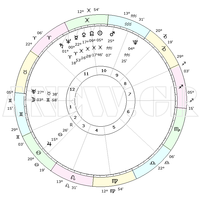 | | ΘΕΣΕΙΣ ΠΛΑΝΗΤΩΝ ΑΣΤΡΟΛΟΓΙΚΟΥ ΧΑΡΤΗ ΤΗΣ ΣΤΙΓΜΗΣ ΑΥΤΗΣ | | | | Πλανήτης | Ζώδιο | Μοίρες | Δεκαήμ. | Σε οίκο | Απόκλιση | | Ακμές των οίκων | | Ηλιος | Ιχθείς | 05°43' | Πρώτο | 11 | 09 S 25 | | 1ος | 07°38' | Ταύρος | | Σελήνη | Δίδυμοι | 03°07' | Πρώτο | 1 | 25 N 56 | | 2ος | 07°46' | Δίδυμοι | | Ερμής | Ιχθείς | 22°15' | Τρίτο | 12 | 00 S 55 | | 3ος | 00°36' | Καρκίνος | | Αφροδίτη | Ιχθείς | 17°23' | Δεύτερο | 11 | 06 S 17 | | 4ος | 22°23' | Καρκίνος | | Αρης | Υδροχόος | 25°04' | Τρίτο | 11 | 14 S 11 | | 5ος | 17°36' | Λέων | | Δίας | Καρκίνος | 15°27'R | Δεύτερο | 3 | 22 N 53 | | 6ος | 21°50' | Παρθένος | | Κρόνος | Κριός | 01°17' | Πρώτο | 12 | 01 S 27 | | 7ος | 07°38' | Σκορπιός | | Ουρανός | Ταύρος | 27°38' | Τρίτο | 1 | 19 N 27 | | 8ος | 07°46' | Τοξότης | | Ποσειδώνας | Κριός | 00°53' | Πρώτο | 12 | 00 S 51 | | 9ος | 00°36' | Αιγόκερως | | Πλούτωνας | Υδροχόος | 04°24' | Πρώτο | 10 | 22 S 54 | | 10ος | 22°23' | Αιγόκερως | | Β. Δεσμός | Ιχθείς | 09°18' | Πρώτο | 11 | 08 S 05 | | 11ος | 17°36' | Υδροχόος | | Ωροσκόπος | Ταύρος | 07°38' | Πρώτο | | | 12ος | 21°50' | Ιχθείς | | Μεσουράνημα | Αιγόκερως | 22°23' | Τρίτο | | | |