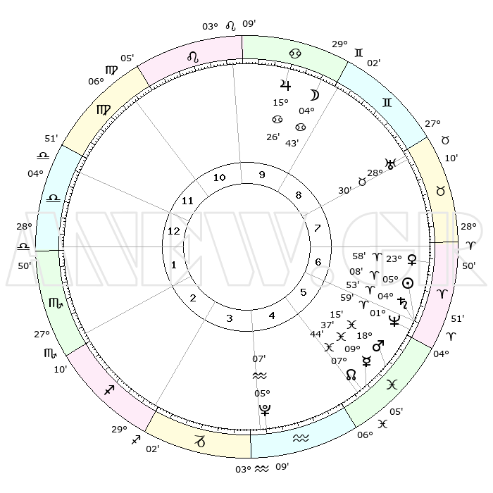 | | ΘΕΣΕΙΣ ΠΛΑΝΗΤΩΝ ΑΣΤΡΟΛΟΓΙΚΟΥ ΧΑΡΤΗ ΤΗΣ ΣΤΙΓΜΗΣ ΑΥΤΗΣ | | | | Πλανήτης | Ζώδιο | Μοίρες | Δεκαήμ. | Σε οίκο | Απόκλιση | | Ακμές των οίκων | | Ηλιος | Κριός | 05°04' | Πρώτο | 6 | 02 N 01 | | 1ος | 10°19' | Ζυγός | | Σελήνη | Καρκίνος | 03°49' | Πρώτο | 9 | 28 N 07 | | 2ος | 07°35' | Σκορπιός | | Ερμής | Ιχθείς | 09°36' | Πρώτο | 5 | 08 S 06 | | 3ος | 08°25' | Τοξότης | | Αφροδίτη | Κριός | 23°54' | Τρίτο | 7 | 08 N 38 | | 4ος | 11°37' | Αιγόκερως | | Αρης | Ιχθείς | 18°12' | Δεύτερο | 6 | 05 S 39 | | 5ος | 14°33' | Υδροχόος | | Δίας | Καρκίνος | 15°26' | Δεύτερο | 10 | 22 N 54 | | 6ος | 14°33' | Ιχθείς | | Κρόνος | Κριός | 04°53' | Πρώτο | 6 | 00 S 01 | | 7ος | 10°19' | Κριός | | Ουρανός | Ταύρος | 28°30' | Τρίτο | 8 | 19 N 39 | | 8ος | 07°35' | Ταύρος | | Ποσειδώνας | Κριός | 01°58' | Πρώτο | 6 | 00 S 25 | | 9ος | 08°25' | Δίδυμοι | | Πλούτωνας | Υδροχόος | 05°06' | Πρώτο | 4 | 22 S 48 | | 10ος | 11°37' | Καρκίνος | | Β. Δεσμός | Ιχθείς | 07°44' | Πρώτο | 5 | 08 S 40 | | 11ος | 14°33' | Λέων | | Ωροσκόπος | Ζυγός | 10°19' | Δεύτερο | | | 12ος | 14°33' | Παρθένος | | Μεσουράνημα | Καρκίνος | 11°37' | Δεύτερο | | | |