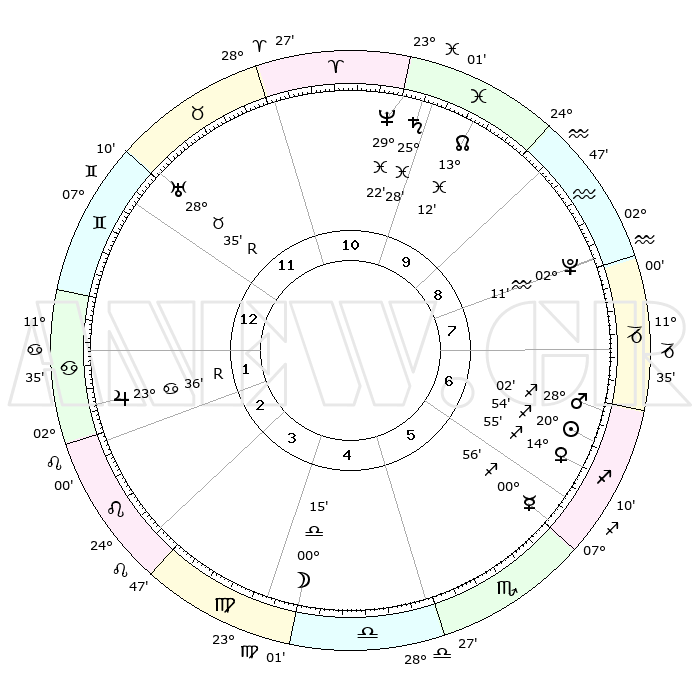 | | ΘΕΣΕΙΣ ΠΛΑΝΗΤΩΝ ΑΣΤΡΟΛΟΓΙΚΟΥ ΧΑΡΤΗ ΤΗΣ ΣΤΙΓΜΗΣ ΑΥΤΗΣ | | | | Πλανήτης | Ζώδιο | Μοίρες | Δεκαήμ. | Σε οίκο | Απόκλιση | | Ακμές των οίκων | | Ηλιος | Τοξότης | 20°50' | Τρίτο | 7 | 23 S 07 | | 1ος | 17°16' | Δίδυμοι | | Σελήνη | Παρθένος | 29°21' | Τρίτο | 5 | 01 S 02 | | 2ος | 09°14' | Καρκίνος | | Ερμής | Τοξότης | 00°51' | Πρώτο | 6 | 18 S 32 | | 3ος | 00°30' | Λέων | | Αφροδίτη | Τοξότης | 14°49' | Δεύτερο | 6 | 22 S 19 | | 4ος | 24°59' | Λέων | | Αρης | Τοξότης | 27°59' | Τρίτο | 7 | 24 S 10 | | 5ος | 26°39' | Παρθένος | | Δίας | Καρκίνος | 23°36'R | Τρίτο | 2 | 21 N 33 | | 6ος | 06°52' | Σκορπιός | | Κρόνος | Ιχθείς | 25°28' | Τρίτο | 10 | 03 S 56 | | 7ος | 17°16' | Τοξότης | | Ουρανός | Ταύρος | 28°35'R | Τρίτο | 12 | 19 N 38 | | 8ος | 09°14' | Αιγόκερως | | Ποσειδώνας | Ιχθείς | 29°22' | Τρίτο | 11 | 01 S 29 | | 9ος | 00°30' | Υδροχόος | | Πλούτωνας | Υδροχόος | 02°11' | Πρώτο | 9 | 23 S 20 | | 10ος | 24°59' | Υδροχόος | | Β. Δεσμός | Ιχθείς | 13°12' | Δεύτερο | 10 | 06 S 36 | | 11ος | 26°39' | Ιχθείς | | Ωροσκόπος | Δίδυμοι | 17°16' | Δεύτερο | | | 12ος | 06°52' | Ταύρος | | Μεσουράνημα | Υδροχόος | 24°59' | Τρίτο | | | |