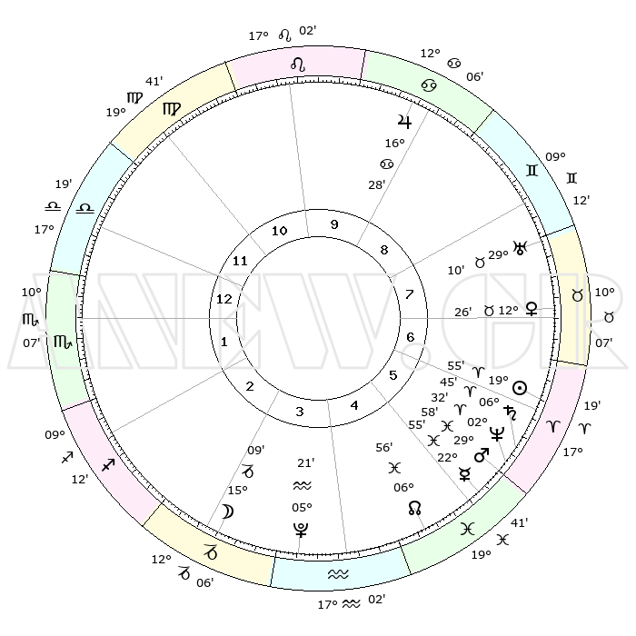 | | ΘΕΣΕΙΣ ΠΛΑΝΗΤΩΝ ΑΣΤΡΟΛΟΓΙΚΟΥ ΧΑΡΤΗ ΤΗΣ ΣΤΙΓΜΗΣ ΑΥΤΗΣ | | | | Πλανήτης | Ζώδιο | Μοίρες | Δεκαήμ. | Σε οίκο | Απόκλιση | | Ακμές των οίκων | | Ηλιος | Κριός | 19°51' | Δεύτερο | 7 | 07 N 46 | | 1ος | 18°28' | Ζυγός | | Σελήνη | Αιγόκερως | 14°15' | Δεύτερο | 3 | 26 S 49 | | 2ος | 16°13' | Σκορπιός | | Ερμής | Ιχθείς | 22°50' | Τρίτο | 5 | 04 S 58 | | 3ος | 17°26' | Τοξότης | | Αφροδίτη | Ταύρος | 12°20' | Δεύτερο | 7 | 15 N 28 | | 4ος | 20°57' | Αιγόκερως | | Αρης | Ιχθείς | 29°55' | Τρίτο | 6 | 00 S 58 | | 5ος | 23°54' | Υδροχόος | | Δίας | Καρκίνος | 16°27' | Δεύτερο | 9 | 22 N 48 | | 6ος | 23°27' | Ιχθείς | | Κρόνος | Κριός | 06°44' | Πρώτο | 6 | 00 N 43 | | 7ος | 18°28' | Κριός | | Ουρανός | Ταύρος | 29°10' | Τρίτο | 8 | 19 N 48 | | 8ος | 16°14' | Ταύρος | | Ποσειδώνας | Κριός | 02°32' | Πρώτο | 6 | 00 S 12 | | 9ος | 17°26' | Δίδυμοι | | Πλούτωνας | Υδροχόος | 05°20' | Πρώτο | 4 | 22 S 47 | | 10ος | 20°57' | Καρκίνος | | Β. Δεσμός | Ιχθείς | 06°57' | Πρώτο | 5 | 08 S 58 | | 11ος | 23°54' | Λέων | | Ωροσκόπος | Ζυγός | 18°28' | Δεύτερο | | | 12ος | 23°27' | Παρθένος | | Μεσουράνημα | Καρκίνος | 20°57' | Τρίτο | | | |