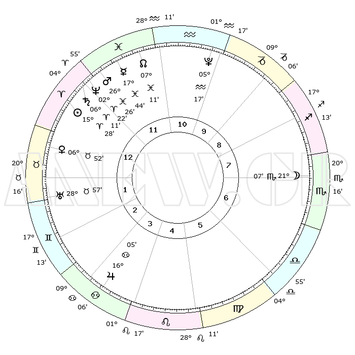| | ΘΕΣΕΙΣ ΠΛΑΝΗΤΩΝ ΑΣΤΡΟΛΟΓΙΚΟΥ ΧΑΡΤΗ ΤΗΣ ΣΤΙΓΜΗΣ ΑΥΤΗΣ | | | | Πλανήτης | Ζώδιο | Μοίρες | Δεκαήμ. | Σε οίκο | Απόκλιση | | Ακμές των οίκων | | Ηλιος | Κριός | 15°13' | Δεύτερο | 3 | 05 N 59 | | 1ος | 12°00' | Αιγόκερως | | Σελήνη | Σκορπιός | 18°03' | Δεύτερο | 10 | 21 S 51 | | 2ος | 22°13' | Υδροχόος | | Ερμής | Ιχθείς | 17°28' | Δεύτερο | 2 | 06 S 39 | | 3ος | 02°28' | Κριός | | Αφροδίτη | Ταύρος | 06°33' | Πρώτο | 4 | 13 N 26 | | 4ος | 04°16' | Ταύρος | | Αρης | Ιχθείς | 26°15' | Τρίτο | 2 | 02 S 26 | | 5ος | 28°51' | Ταύρος | | Δίας | Καρκίνος | 16°04' | Δεύτερο | 7 | 22 N 50 | | 6ος | 20°07' | Δίδυμοι | | Κρόνος | Κριός | 06°09' | Πρώτο | 3 | 00 N 29 | | 7ος | 12°00' | Καρκίνος | | Ουρανός | Ταύρος | 28°57' | Τρίτο | 5 | 19 N 45 | | 8ος | 22°13' | Λέων | | Ποσειδώνας | Κριός | 02°22' | Πρώτο | 2 | 00 S 16 | | 9ος | 02°28' | Ζυγός | | Πλούτωνας | Υδροχόος | 05°17' | Πρώτο | 1 | 22 S 47 | | 10ος | 04°16' | Σκορπιός | | Β. Δεσμός | Ιχθείς | 07°12' | Πρώτο | 2 | 08 S 52 | | 11ος | 28°51' | Σκορπιός | | Ωροσκόπος | Αιγόκερως | 12°00' | Δεύτερο | | | 12ος | 20°07' | Τοξότης | | Μεσουράνημα | Σκορπιός | 04°16' | Πρώτο | | | |