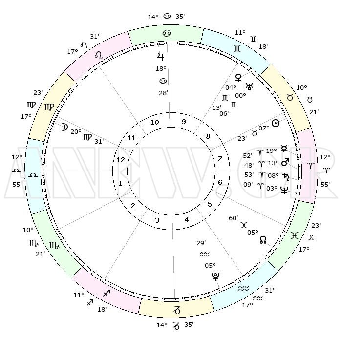 | | ΘΕΣΕΙΣ ΠΛΑΝΗΤΩΝ ΑΣΤΡΟΛΟΓΙΚΟΥ ΧΑΡΤΗ ΤΗΣ ΣΤΙΓΜΗΣ ΑΥΤΗΣ | | | | Πλανήτης | Ζώδιο | Μοίρες | Δεκαήμ. | Σε οίκο | Απόκλιση | | Ακμές των οίκων | | Ηλιος | Ταύρος | 07°18' | Πρώτο | 8 | 13 N 57 | | 1ος | 21°38' | Παρθένος | | Σελήνη | Παρθένος | 19°35' | Δεύτερο | 12 | 03 N 08 | | 2ος | 17°34' | Ζυγός | | Ερμής | Κριός | 19°44' | Δεύτερο | 8 | 05 N 38 | | 3ος | 17°39' | Σκορπιός | | Αφροδίτη | Δίδυμοι | 04°08' | Πρώτο | 9 | 21 N 42 | | 4ος | 20°35' | Τοξότης | | Αρης | Κριός | 13°44' | Δεύτερο | 7 | 04 N 35 | | 5ος | 23°43' | Αιγόκερως | | Δίας | Καρκίνος | 18°27' | Δεύτερο | 10 | 22 N 33 | | 6ος | 24°29' | Υδροχόος | | Κρόνος | Κριός | 08°52' | Πρώτο | 7 | 01 N 31 | | 7ος | 21°38' | Ιχθείς | | Ουρανός | Δίδυμοι | 00°05' | Πρώτο | 9 | 20 N 00 | | 8ος | 17°34' | Κριός | | Ποσειδώνας | Κριός | 03°09' | Πρώτο | 7 | 00 N 03 | | 9ος | 17°39' | Ταύρος | | Πλούτωνας | Υδροχόος | 05°29' | Πρώτο | 5 | 22 S 48 | | 10ος | 20°35' | Δίδυμοι | | Β. Δεσμός | Ιχθείς | 05°60' | Πρώτο | 6 | 09 S 19 | | 11ος | 23°43' | Καρκίνος | | Ωροσκόπος | Παρθένος | 21°38' | Τρίτο | | | 12ος | 24°29' | Λέων | | Μεσουράνημα | Δίδυμοι | 20°35' | Τρίτο | | | |