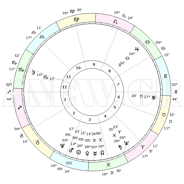 | | ΘΕΣΕΙΣ ΠΛΑΝΗΤΩΝ ΑΣΤΡΟΛΟΓΙΚΟΥ ΧΑΡΤΗ ΤΗΣ ΣΤΙΓΜΗΣ ΑΥΤΗΣ | | | | Πλανήτης | Ζώδιο | Μοίρες | Δεκαήμ. | Σε οίκο | Απόκλιση | | Ακμές των οίκων | | Ηλιος | Υδροχόος | 20°11' | Τρίτο | 3 | 14 S 45 | | 1ος | 13°33' | Σκορπιός | | Σελήνη | Σκορπιός | 13°50' | Δεύτερο | 1 | 20 S 31 | | 2ος | 12°54' | Τοξότης | | Ερμής | Ιχθείς | 03°29' | Πρώτο | 4 | 11 S 13 | | 3ος | 16°12' | Αιγόκερως | | Αφροδίτη | Υδροχόος | 28°09' | Τρίτο | 4 | 13 S 28 | | 4ος | 21°23' | Υδροχόος | | Αρης | Υδροχόος | 12°58' | Δεύτερο | 3 | 17 S 56 | | 5ος | 23°53' | Ιχθείς | | Δίας | Καρκίνος | 16°32'R | Δεύτερο | 9 | 22 N 44 | | 6ος | 21°06' | Κριός | | Κρόνος | Ιχθείς | 29°34' | Τρίτο | 5 | 02 S 09 | | 7ος | 13°33' | Ταύρος | | Ουρανός | Ταύρος | 27°28' | Τρίτο | 7 | 19 N 24 | | 8ος | 12°54' | Δίδυμοι | | Ποσειδώνας | Κριός | 00°23' | Πρώτο | 5 | 01 S 03 | | 9ος | 16°12' | Καρκίνος | | Πλούτωνας | Υδροχόος | 03°57' | Πρώτο | 3 | 22 S 59 | | 10ος | 21°23' | Λέων | | Β. Δεσμός | Ιχθείς | 10°06' | Δεύτερο | 4 | 07 S 47 | | 11ος | 23°53' | Παρθένος | | Ωροσκόπος | Σκορπιός | 13°33' | Δεύτερο | | | 12ος | 21°06' | Ζυγός | | Μεσουράνημα | Λέων | 21°23' | Τρίτο | | | |