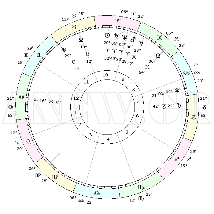 | | ΘΕΣΕΙΣ ΠΛΑΝΗΤΩΝ ΑΣΤΡΟΛΟΓΙΚΟΥ ΧΑΡΤΗ ΤΗΣ ΣΤΙΓΜΗΣ ΑΥΤΗΣ | | | | Πλανήτης | Ζώδιο | Μοίρες | Δεκαήμ. | Σε οίκο | Απόκλιση | | Ακμές των οίκων | | Ηλιος | Κριός | 20°29' | Τρίτο | 11 | 08 N 00 | | 1ος | 02°45' | Καρκίνος | | Σελήνη | Αιγόκερως | 21°58' | Τρίτο | 7 | 25 S 19 | | 2ος | 23°23' | Καρκίνος | | Ερμής | Ιχθείς | 23°37' | Τρίτο | 10 | 04 S 42 | | 3ος | 15°23' | Λέων | | Αφροδίτη | Ταύρος | 13°07' | Δεύτερο | 11 | 15 N 44 | | 4ος | 12°09' | Παρθένος | | Αρης | Κριός | 00°25' | Πρώτο | 10 | 00 S 46 | | 5ος | 16°30' | Ζυγός | | Δίας | Καρκίνος | 16°31' | Δεύτερο | 1 | 22 N 47 | | 6ος | 26°17' | Σκορπιός | | Κρόνος | Κριός | 06°49' | Πρώτο | 10 | 00 N 44 | | 7ος | 02°45' | Αιγόκερως | | Ουρανός | Ταύρος | 29°12' | Τρίτο | 12 | 19 N 48 | | 8ος | 23°23' | Αιγόκερως | | Ποσειδώνας | Κριός | 02°33' | Πρώτο | 10 | 00 S 11 | | 9ος | 15°23' | Υδροχόος | | Πλούτωνας | Υδροχόος | 05°21' | Πρώτο | 8 | 22 S 47 | | 10ος | 12°09' | Ιχθείς | | Β. Δεσμός | Ιχθείς | 06°55' | Πρώτο | 9 | 08 S 58 | | 11ος | 16°30' | Κριός | | Ωροσκόπος | Καρκίνος | 02°45' | Πρώτο | | | 12ος | 26°17' | Ταύρος | | Μεσουράνημα | Ιχθείς | 12°09' | Δεύτερο | | | |