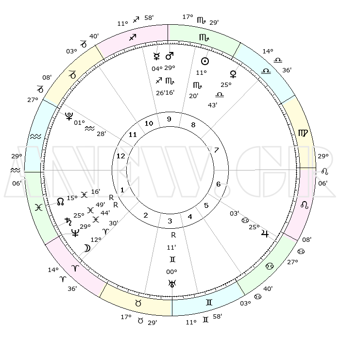 | | ΘΕΣΕΙΣ ΠΛΑΝΗΤΩΝ ΑΣΤΡΟΛΟΓΙΚΟΥ ΧΑΡΤΗ ΤΗΣ ΣΤΙΓΜΗΣ ΑΥΤΗΣ | | | | Πλανήτης | Ζώδιο | Μοίρες | Δεκαήμ. | Σε οίκο | Απόκλιση | | Ακμές των οίκων | | Ηλιος | Σκορπιός | 11°03' | Δεύτερο | 12 | 15 S 08 | | 1ος | 15°30' | Σκορπιός | | Σελήνη | Κριός | 08°15' | Πρώτο | 5 | 04 N 59 | | 2ος | 15°01' | Τοξότης | | Ερμής | Τοξότης | 04°13' | Πρώτο | 1 | 23 S 49 | | 3ος | 18°34' | Αιγόκερως | | Αφροδίτη | Ζυγός | 25°21' | Τρίτο | 12 | 08 S 28 | | 4ος | 23°52' | Υδροχόος | | Αρης | Σκορπιός | 29°04' | Τρίτο | 1 | 20 S 21 | | 5ος | 26°16' | Ιχθείς | | Δίας | Καρκίνος | 25°02' | Τρίτο | 9 | 21 N 12 | | 6ος | 23°14' | Κριός | | Κρόνος | Ιχθείς | 25°50'R | Τρίτο | 4 | 03 S 55 | | 7ος | 15°30' | Ταύρος | | Ουρανός | Δίδυμοι | 00°11'R | Πρώτο | 7 | 19 N 59 | | 8ος | 15°01' | Δίδυμοι | | Ποσειδώνας | Ιχθείς | 29°45'R | Τρίτο | 5 | 01 S 21 | | 9ος | 18°34' | Καρκίνος | | Πλούτωνας | Υδροχόος | 01°28' | Πρώτο | 3 | 23 S 30 | | 10ος | 23°52' | Λέων | | Β. Δεσμός | Ιχθείς | 15°17' | Δεύτερο | 4 | 05 S 48 | | 11ος | 26°16' | Παρθένος | | Ωροσκόπος | Σκορπιός | 15°30' | Δεύτερο | | | 12ος | 23°14' | Ζυγός | | Μεσουράνημα | Λέων | 23°52' | Τρίτο | | | |