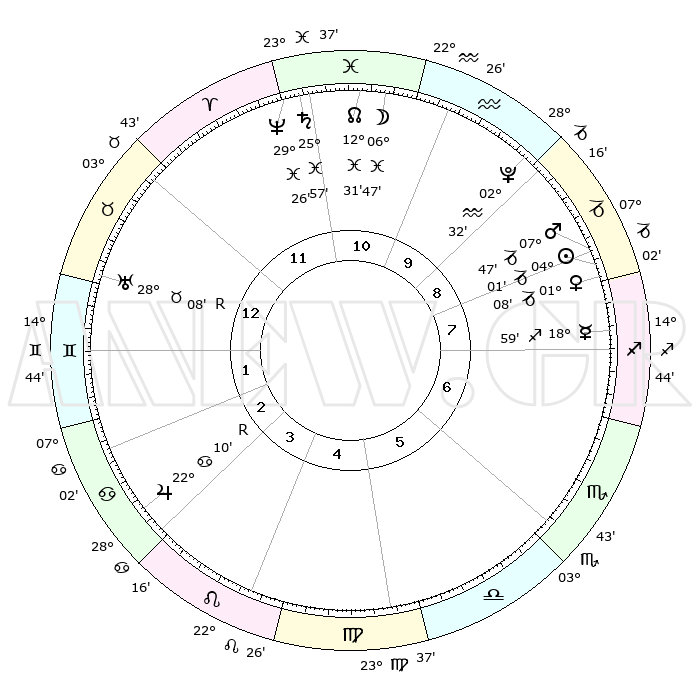 | | ΘΕΣΕΙΣ ΠΛΑΝΗΤΩΝ ΑΣΤΡΟΛΟΓΙΚΟΥ ΧΑΡΤΗ ΤΗΣ ΣΤΙΓΜΗΣ ΑΥΤΗΣ | | | | Πλανήτης | Ζώδιο | Μοίρες | Δεκαήμ. | Σε οίκο | Απόκλιση | | Ακμές των οίκων | | Ηλιος | Αιγόκερως | 03°56' | Πρώτο | 9 | 23 S 22 | | 1ος | 09°48' | Ταύρος | | Σελήνη | Ιχθείς | 05°44' | Πρώτο | 11 | 09 S 52 | | 2ος | 09°22' | Δίδυμοι | | Ερμής | Τοξότης | 18°52' | Δεύτερο | 8 | 22 S 46 | | 3ος | 02°01' | Καρκίνος | | Αφροδίτη | Αιγόκερως | 01°02' | Πρώτο | 8 | 23 S 41 | | 4ος | 23°50' | Καρκίνος | | Αρης | Αιγόκερως | 07°44' | Πρώτο | 9 | 24 S 03 | | 5ος | 19°19' | Λέων | | Δίας | Καρκίνος | 22°11'R | Τρίτο | 3 | 21 N 50 | | 6ος | 23°59' | Παρθένος | | Κρόνος | Ιχθείς | 25°56' | Τρίτο | 12 | 03 S 42 | | 7ος | 09°48' | Σκορπιός | | Ουρανός | Ταύρος | 28°08'R | Τρίτο | 1 | 19 N 33 | | 8ος | 09°22' | Τοξότης | | Ποσειδώνας | Ιχθείς | 29°26' | Τρίτο | 12 | 01 S 27 | | 9ος | 02°01' | Αιγόκερως | | Πλούτωνας | Υδροχόος | 02°32' | Πρώτο | 10 | 23 S 16 | | 10ος | 23°50' | Αιγόκερως | | Β. Δεσμός | Ιχθείς | 12°31' | Δεύτερο | 11 | 06 S 52 | | 11ος | 19°19' | Υδροχόος | | Ωροσκόπος | Ταύρος | 09°48' | Πρώτο | | | 12ος | 23°59' | Ιχθείς | | Μεσουράνημα | Αιγόκερως | 23°50' | Τρίτο | | | |