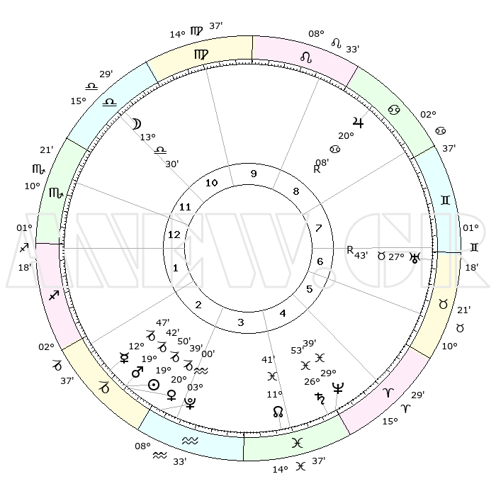 | | ΘΕΣΕΙΣ ΠΛΑΝΗΤΩΝ ΑΣΤΡΟΛΟΓΙΚΟΥ ΧΑΡΤΗ ΤΗΣ ΣΤΙΓΜΗΣ ΑΥΤΗΣ | | | | Πλανήτης | Ζώδιο | Μοίρες | Δεκαήμ. | Σε οίκο | Απόκλιση | | Ακμές των οίκων | | Ηλιος | Αιγόκερως | 19°15' | Δεύτερο | 8 | 22 S 03 | | 1ος | 07°14' | Δίδυμοι | | Σελήνη | Ζυγός | 06°23' | Πρώτο | 5 | 04 S 36 | | 2ος | 00°41' | Καρκίνος | | Ερμής | Αιγόκερως | 11°52' | Δεύτερο | 8 | 24 S 18 | | 3ος | 21°56' | Καρκίνος | | Αφροδίτη | Αιγόκερως | 19°56' | Δεύτερο | 8 | 22 S 45 | | 4ος | 15°18' | Λέων | | Αρης | Αιγόκερως | 19°15' | Δεύτερο | 8 | 22 S 59 | | 5ος | 15°04' | Παρθένος | | Δίας | Καρκίνος | 20°13'R | Τρίτο | 2 | 22 N 10 | | 6ος | 24°30' | Ζυγός | | Κρόνος | Ιχθείς | 26°50' | Τρίτο | 11 | 03 S 18 | | 7ος | 07°14' | Τοξότης | | Ουρανός | Ταύρος | 27°44'R | Τρίτο | 12 | 19 N 28 | | 8ος | 00°41' | Αιγόκερως | | Ποσειδώνας | Ιχθείς | 29°38' | Τρίτο | 11 | 01 S 22 | | 9ος | 21°56' | Αιγόκερως | | Πλούτωνας | Υδροχόος | 02°59' | Πρώτο | 9 | 23 S 10 | | 10ος | 15°18' | Υδροχόος | | Β. Δεσμός | Ιχθείς | 11°43' | Δεύτερο | 10 | 07 S 10 | | 11ος | 15°04' | Ιχθείς | | Ωροσκόπος | Δίδυμοι | 07°14' | Πρώτο | | | 12ος | 24°30' | Κριός | | Μεσουράνημα | Υδροχόος | 15°18' | Δεύτερο | | | |