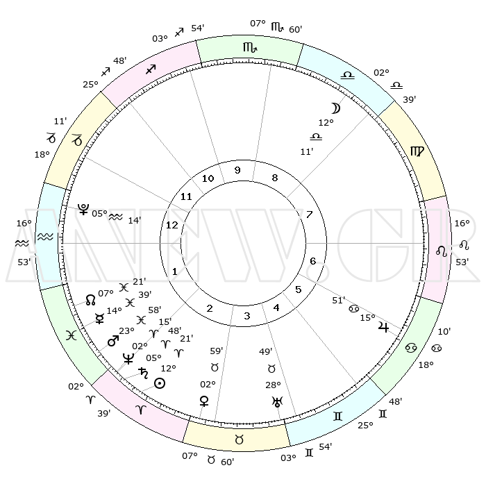 | | ΘΕΣΕΙΣ ΠΛΑΝΗΤΩΝ ΑΣΤΡΟΛΟΓΙΚΟΥ ΧΑΡΤΗ ΤΗΣ ΣΤΙΓΜΗΣ ΑΥΤΗΣ | | | | Πλανήτης | Ζώδιο | Μοίρες | Δεκαήμ. | Σε οίκο | Απόκλιση | | Ακμές των οίκων | | Ηλιος | Κριός | 12°17' | Δεύτερο | 2 | 04 N 51 | | 1ος | 21°46' | Αιγόκερως | | Σελήνη | Ζυγός | 11°27' | Δεύτερο | 8 | 07 S 07 | | 2ος | 04°18' | Ιχθείς | | Ερμής | Ιχθείς | 14°35' | Δεύτερο | 2 | 07 S 25 | | 3ος | 13°51' | Κριός | | Αφροδίτη | Ταύρος | 02°54' | Πρώτο | 3 | 12 N 06 | | 4ος | 13°48' | Ταύρος | | Αρης | Ιχθείς | 23°56' | Τρίτο | 2 | 03 S 22 | | 5ος | 07°16' | Δίδυμοι | | Δίας | Καρκίνος | 15°51' | Δεύτερο | 6 | 22 N 52 | | 6ος | 28°29' | Δίδυμοι | | Κρόνος | Κριός | 05°47' | Πρώτο | 2 | 00 N 21 | | 7ος | 21°46' | Καρκίνος | | Ουρανός | Ταύρος | 28°48' | Τρίτο | 4 | 19 N 43 | | 8ος | 04°18' | Παρθένος | | Ποσειδώνας | Κριός | 02°15' | Πρώτο | 2 | 00 S 18 | | 9ος | 13°51' | Ζυγός | | Πλούτωνας | Υδροχόος | 05°14' | Πρώτο | 1 | 22 S 47 | | 10ος | 13°48' | Σκορπιός | | Β. Δεσμός | Ιχθείς | 07°21' | Πρώτο | 2 | 08 S 49 | | 11ος | 07°16' | Τοξότης | | Ωροσκόπος | Αιγόκερως | 21°46' | Τρίτο | | | 12ος | 28°29' | Τοξότης | | Μεσουράνημα | Σκορπιός | 13°48' | Δεύτερο | | | |