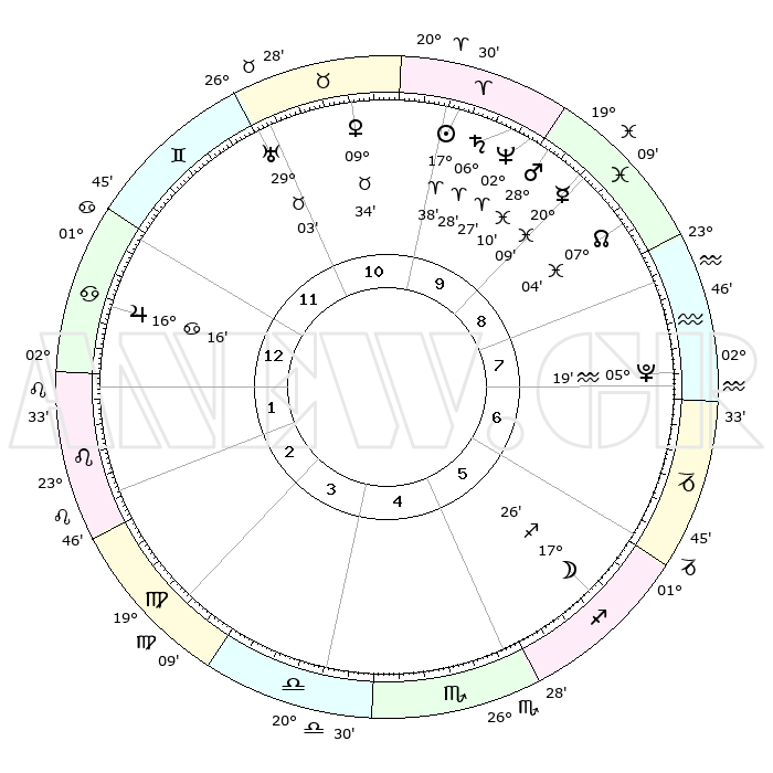 | | ΘΕΣΕΙΣ ΠΛΑΝΗΤΩΝ ΑΣΤΡΟΛΟΓΙΚΟΥ ΧΑΡΤΗ ΤΗΣ ΣΤΙΓΜΗΣ ΑΥΤΗΣ | | | | Πλανήτης | Ζώδιο | Μοίρες | Δεκαήμ. | Σε οίκο | Απόκλιση | | Ακμές των οίκων | | Ηλιος | Κριός | 17°35' | Δεύτερο | 10 | 06 N 54 | | 1ος | 15°39' | Καρκίνος | | Σελήνη | Τοξότης | 16°45' | Δεύτερο | 6 | 27 S 51 | | 2ος | 06°05' | Λέων | | Ερμής | Ιχθείς | 20°06' | Τρίτο | 9 | 05 S 52 | | 3ος | 29°19' | Λέων | | Αφροδίτη | Ταύρος | 09°30' | Πρώτο | 11 | 14 N 29 | | 4ος | 28°14' | Παρθένος | | Αρης | Ιχθείς | 28°07' | Τρίτο | 9 | 01 S 41 | | 5ος | 03°60' | Σκορπιός | | Δίας | Καρκίνος | 16°15' | Δεύτερο | 1 | 22 N 49 | | 6ος | 12°06' | Τοξότης | | Κρόνος | Κριός | 06°27' | Πρώτο | 10 | 00 N 36 | | 7ος | 15°39' | Αιγόκερως | | Ουρανός | Ταύρος | 29°03' | Τρίτο | 11 | 19 N 47 | | 8ος | 06°05' | Υδροχόος | | Ποσειδώνας | Κριός | 02°27' | Πρώτο | 10 | 00 S 14 | | 9ος | 29°19' | Υδροχόος | | Πλούτωνας | Υδροχόος | 05°19' | Πρώτο | 7 | 22 S 47 | | 10ος | 28°14' | Ιχθείς | | Β. Δεσμός | Ιχθείς | 07°04' | Πρώτο | 9 | 08 S 55 | | 11ος | 03°60' | Ταύρος | | Ωροσκόπος | Καρκίνος | 15°39' | Δεύτερο | | | 12ος | 12°06' | Δίδυμοι | | Μεσουράνημα | Ιχθείς | 28°14' | Τρίτο | | | |