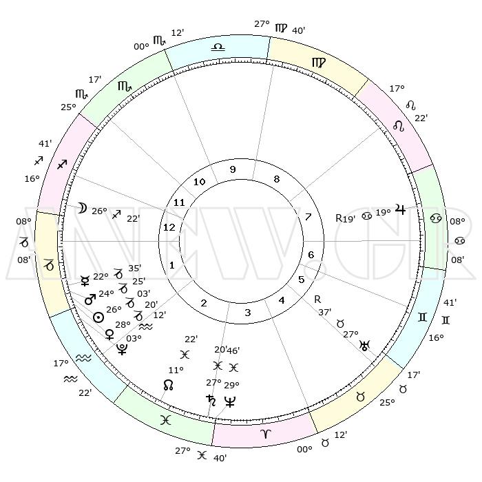 | | ΘΕΣΕΙΣ ΠΛΑΝΗΤΩΝ ΑΣΤΡΟΛΟΓΙΚΟΥ ΧΑΡΤΗ ΤΗΣ ΣΤΙΓΜΗΣ ΑΥΤΗΣ | | | | Πλανήτης | Ζώδιο | Μοίρες | Δεκαήμ. | Σε οίκο | Απόκλιση | | Ακμές των οίκων | | Ηλιος | Αιγόκερως | 25°59' | Τρίτο | 2 | 20 S 57 | | 1ος | 16°36' | Τοξότης | | Σελήνη | Τοξότης | 25°34' | Τρίτο | 1 | 28 S 18 | | 2ος | 20°37' | Αιγόκερως | | Ερμής | Αιγόκερως | 22°28' | Τρίτο | 2 | 23 S 23 | | 3ος | 29°04' | Υδροχόος | | Αφροδίτη | Αιγόκερως | 28°15' | Τρίτο | 2 | 21 S 30 | | 4ος | 04°40' | Κριός | | Αρης | Αιγόκερως | 24°22' | Τρίτο | 2 | 22 S 12 | | 5ος | 03°12' | Ταύρος | | Δίας | Καρκίνος | 19°20'R | Δεύτερο | 7 | 22 N 19 | | 6ος | 26°11' | Ταύρος | | Κρόνος | Ιχθείς | 27°20' | Τρίτο | 3 | 03 S 05 | | 7ος | 16°36' | Δίδυμοι | | Ουρανός | Ταύρος | 27°37'R | Τρίτο | 6 | 19 N 26 | | 8ος | 20°37' | Καρκίνος | | Ποσειδώνας | Ιχθείς | 29°46' | Τρίτο | 3 | 01 S 19 | | 9ος | 29°04' | Λέων | | Πλούτωνας | Υδροχόος | 03°12' | Πρώτο | 2 | 23 S 07 | | 10ος | 04°40' | Ζυγός | | Β. Δεσμός | Ιχθείς | 11°22' | Δεύτερο | 3 | 07 S 18 | | 11ος | 03°12' | Σκορπιός | | Ωροσκόπος | Τοξότης | 16°36' | Δεύτερο | | | 12ος | 26°11' | Σκορπιός | | Μεσουράνημα | Ζυγός | 04°40' | Πρώτο | | | |