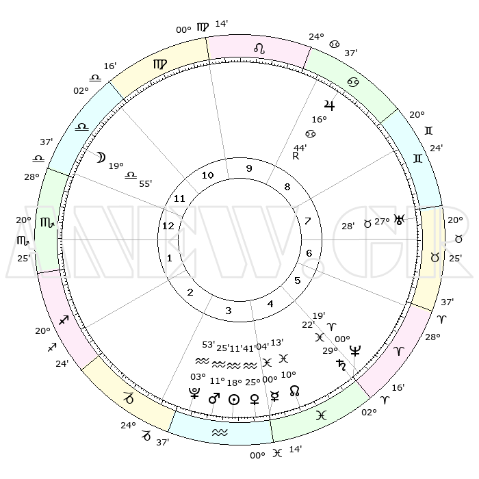 | | ΘΕΣΕΙΣ ΠΛΑΝΗΤΩΝ ΑΣΤΡΟΛΟΓΙΚΟΥ ΧΑΡΤΗ ΤΗΣ ΣΤΙΓΜΗΣ ΑΥΤΗΣ | | | | Πλανήτης | Ζώδιο | Μοίρες | Δεκαήμ. | Σε οίκο | Απόκλιση | | Ακμές των οίκων | | Ηλιος | Υδροχόος | 18°08' | Δεύτερο | 4 | 15 S 23 | | 1ος | 04°19' | Σκορπιός | | Σελήνη | Ζυγός | 19°13' | Δεύτερο | 12 | 10 S 39 | | 2ος | 03°00' | Τοξότης | | Ερμής | Υδροχόος | 29°58' | Τρίτο | 4 | 12 S 44 | | 3ος | 05°20' | Αιγόκερως | | Αφροδίτη | Υδροχόος | 25°37' | Τρίτο | 4 | 14 S 20 | | 4ος | 09°49' | Υδροχόος | | Αρης | Υδροχόος | 11°23' | Δεύτερο | 4 | 18 S 23 | | 5ος | 12°40' | Ιχθείς | | Δίας | Καρκίνος | 16°44'R | Δεύτερο | 9 | 22 N 42 | | 6ος | 10°55' | Κριός | | Κρόνος | Ιχθείς | 29°21' | Τρίτο | 5 | 02 S 14 | | 7ος | 04°19' | Ταύρος | | Ουρανός | Ταύρος | 27°28' | Τρίτο | 7 | 19 N 24 | | 8ος | 03°00' | Δίδυμοι | | Ποσειδώνας | Κριός | 00°19' | Πρώτο | 5 | 01 S 05 | | 9ος | 05°20' | Καρκίνος | | Πλούτωνας | Υδροχόος | 03°53' | Πρώτο | 3 | 22 S 59 | | 10ος | 09°49' | Λέων | | Β. Δεσμός | Ιχθείς | 10°13' | Δεύτερο | 4 | 07 S 44 | | 11ος | 12°40' | Παρθένος | | Ωροσκόπος | Σκορπιός | 04°19' | Πρώτο | | | 12ος | 10°55' | Ζυγός | | Μεσουράνημα | Λέων | 09°49' | Πρώτο | | | |