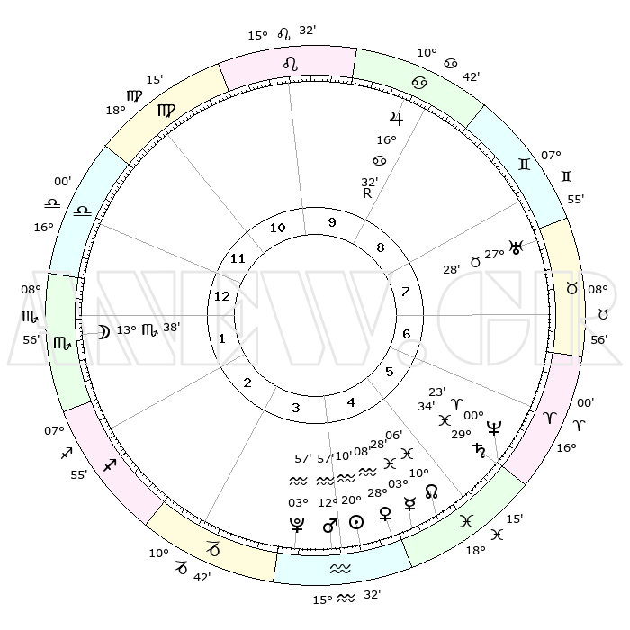 | | ΘΕΣΕΙΣ ΠΛΑΝΗΤΩΝ ΑΣΤΡΟΛΟΓΙΚΟΥ ΧΑΡΤΗ ΤΗΣ ΣΤΙΓΜΗΣ ΑΥΤΗΣ | | | | Πλανήτης | Ζώδιο | Μοίρες | Δεκαήμ. | Σε οίκο | Απόκλιση | | Ακμές των οίκων | | Ηλιος | Υδροχόος | 20°07' | Τρίτο | 4 | 14 S 47 | | 1ος | 22°09' | Ζυγός | | Σελήνη | Σκορπιός | 12°57' | Δεύτερο | 1 | 20 S 13 | | 2ος | 20°07' | Σκορπιός | | Ερμής | Ιχθείς | 03°22' | Πρώτο | 5 | 11 S 17 | | 3ος | 21°32' | Τοξότης | | Αφροδίτη | Υδροχόος | 28°04' | Τρίτο | 4 | 13 S 30 | | 4ος | 25°14' | Αιγόκερως | | Αρης | Υδροχόος | 12°55' | Δεύτερο | 4 | 17 S 57 | | 5ος | 28°11' | Υδροχόος | | Δίας | Καρκίνος | 16°33'R | Δεύτερο | 9 | 22 N 43 | | 6ος | 27°30' | Ιχθείς | | Κρόνος | Ιχθείς | 29°34' | Τρίτο | 6 | 02 S 09 | | 7ος | 22°09' | Κριός | | Ουρανός | Ταύρος | 27°28' | Τρίτο | 8 | 19 N 24 | | 8ος | 20°07' | Ταύρος | | Ποσειδώνας | Κριός | 00°22' | Πρώτο | 6 | 01 S 03 | | 9ος | 21°32' | Δίδυμοι | | Πλούτωνας | Υδροχόος | 03°57' | Πρώτο | 4 | 22 S 59 | | 10ος | 25°14' | Καρκίνος | | Β. Δεσμός | Ιχθείς | 10°07' | Δεύτερο | 5 | 07 S 47 | | 11ος | 28°11' | Λέων | | Ωροσκόπος | Ζυγός | 22°09' | Τρίτο | | | 12ος | 27°30' | Παρθένος | | Μεσουράνημα | Καρκίνος | 25°14' | Τρίτο | | | |