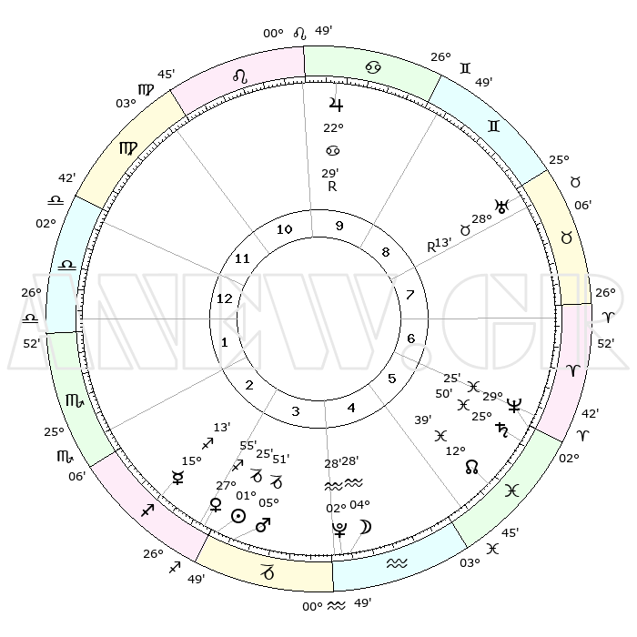 | | ΘΕΣΕΙΣ ΠΛΑΝΗΤΩΝ ΑΣΤΡΟΛΟΓΙΚΟΥ ΧΑΡΤΗ ΤΗΣ ΣΤΙΓΜΗΣ ΑΥΤΗΣ | | | | Πλανήτης | Ζώδιο | Μοίρες | Δεκαήμ. | Σε οίκο | Απόκλιση | | Ακμές των οίκων | | Ηλιος | Αιγόκερως | 01°20' | Πρώτο | 4 | 23 S 26 | | 1ος | 00°33' | Ζυγός | | Σελήνη | Υδροχόος | 03°21' | Πρώτο | 4 | 22 S 25 | | 2ος | 27°11' | Ζυγός | | Ερμής | Τοξότης | 15°06' | Δεύτερο | 3 | 22 S 05 | | 3ος | 27°39' | Σκορπιός | | Αφροδίτη | Τοξότης | 27°48' | Τρίτο | 3 | 23 S 34 | | 4ος | 00°38' | Αιγόκερως | | Αρης | Αιγόκερως | 05°47' | Πρώτο | 4 | 24 S 08 | | 5ος | 03°36' | Υδροχόος | | Δίας | Καρκίνος | 22°29'R | Τρίτο | 10 | 21 N 46 | | 6ος | 04°01' | Ιχθείς | | Κρόνος | Ιχθείς | 25°49' | Τρίτο | 6 | 03 S 46 | | 7ος | 00°33' | Κριός | | Ουρανός | Ταύρος | 28°13'R | Τρίτο | 9 | 19 N 34 | | 8ος | 27°11' | Κριός | | Ποσειδώνας | Ιχθείς | 29°25' | Τρίτο | 6 | 01 S 28 | | 9ος | 27°39' | Ταύρος | | Πλούτωνας | Υδροχόος | 02°27' | Πρώτο | 4 | 23 S 17 | | 10ος | 00°38' | Καρκίνος | | Β. Δεσμός | Ιχθείς | 12°39' | Δεύτερο | 6 | 06 S 49 | | 11ος | 03°36' | Λέων | | Ωροσκόπος | Ζυγός | 00°33' | Πρώτο | | | 12ος | 04°01' | Παρθένος | | Μεσουράνημα | Καρκίνος | 00°38' | Πρώτο | | | |