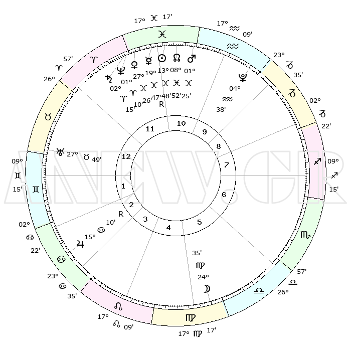 | | ΘΕΣΕΙΣ ΠΛΑΝΗΤΩΝ ΑΣΤΡΟΛΟΓΙΚΟΥ ΧΑΡΤΗ ΤΗΣ ΣΤΙΓΜΗΣ ΑΥΤΗΣ | | | | Πλανήτης | Ζώδιο | Μοίρες | Δεκαήμ. | Σε οίκο | Απόκλιση | | Ακμές των οίκων | | Ηλιος | Ιχθείς | 13°44' | Δεύτερο | 11 | 06 S 24 | | 1ος | 13°22' | Ταύρος | | Σελήνη | Παρθένος | 23°49' | Τρίτο | 5 | 01 N 13 | | 2ος | 12°01' | Δίδυμοι | | Ερμής | Ιχθείς | 19°50'R | Δεύτερο | 11 | 00 S 40 | | 3ος | 04°22' | Καρκίνος | | Αφροδίτη | Ιχθείς | 27°21' | Τρίτο | 11 | 02 S 15 | | 4ος | 26°17' | Καρκίνος | | Αρης | Ιχθείς | 01°22' | Πρώτο | 11 | 12 S 01 | | 5ος | 22°13' | Λέων | | Δίας | Καρκίνος | 15°10'R | Δεύτερο | 3 | 22 N 55 | | 6ος | 27°36' | Παρθένος | | Κρόνος | Κριός | 02°14' | Πρώτο | 12 | 01 S 04 | | 7ος | 13°22' | Σκορπιός | | Ουρανός | Ταύρος | 27°49' | Τρίτο | 1 | 19 N 30 | | 8ος | 12°01' | Τοξότης | | Ποσειδώνας | Κριός | 01°10' | Πρώτο | 12 | 00 S 44 | | 9ος | 04°22' | Αιγόκερως | | Πλούτωνας | Υδροχόος | 04°37' | Πρώτο | 10 | 22 S 52 | | 10ος | 26°17' | Αιγόκερως | | Β. Δεσμός | Ιχθείς | 08°52' | Πρώτο | 11 | 08 S 15 | | 11ος | 22°13' | Υδροχόος | | Ωροσκόπος | Ταύρος | 13°22' | Δεύτερο | | | 12ος | 27°36' | Ιχθείς | | Μεσουράνημα | Αιγόκερως | 26°17' | Τρίτο | | | |