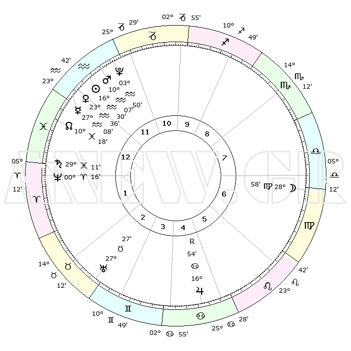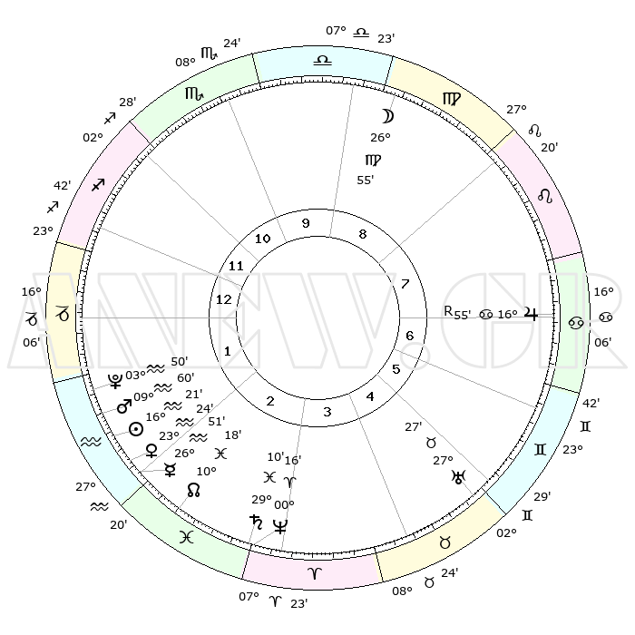 | | ΘΕΣΕΙΣ ΠΛΑΝΗΤΩΝ ΑΣΤΡΟΛΟΓΙΚΟΥ ΧΑΡΤΗ ΤΗΣ ΣΤΙΓΜΗΣ ΑΥΤΗΣ | | | | Πλανήτης | Ζώδιο | Μοίρες | Δεκαήμ. | Σε οίκο | Απόκλιση | | Ακμές των οίκων | | Ηλιος | Υδροχόος | 16°27' | Δεύτερο | 12 | 15 S 54 | | 1ος | 01°35' | Ιχθείς | | Σελήνη | Παρθένος | 28°13' | Τρίτο | 7 | 00 S 52 | | 2ος | 16°52' | Κριός | | Ερμής | Υδροχόος | 27°02' | Τρίτο | 12 | 13 S 56 | | 3ος | 19°16' | Ταύρος | | Αφροδίτη | Υδροχόος | 23°32' | Τρίτο | 12 | 15 S 01 | | 4ος | 13°31' | Δίδυμοι | | Αρης | Υδροχόος | 10°04' | Δεύτερο | 12 | 18 S 44 | | 5ος | 05°12' | Καρκίνος | | Δίας | Καρκίνος | 16°54'R | Δεύτερο | 5 | 22 N 40 | | 6ος | 28°55' | Καρκίνος | | Κρόνος | Ιχθείς | 29°11' | Τρίτο | 1 | 02 S 19 | | 7ος | 01°35' | Παρθένος | | Ουρανός | Ταύρος | 27°27' | Τρίτο | 3 | 19 N 24 | | 8ος | 16°52' | Ζυγός | | Ποσειδώνας | Κριός | 00°16' | Πρώτο | 1 | 01 S 06 | | 9ος | 19°16' | Σκορπιός | | Πλούτωνας | Υδροχόος | 03°50' | Πρώτο | 12 | 23 S 00 | | 10ος | 13°31' | Τοξότης | | Β. Δεσμός | Ιχθείς | 10°18' | Δεύτερο | 1 | 07 S 42 | | 11ος | 05°12' | Αιγόκερως | | Ωροσκόπος | Ιχθείς | 01°35' | Πρώτο | | | 12ος | 28°55' | Αιγόκερως | | Μεσουράνημα | Τοξότης | 13°31' | Δεύτερο | | | |