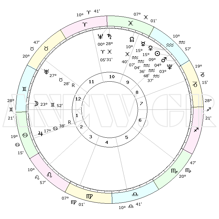 | | ΘΕΣΕΙΣ ΠΛΑΝΗΤΩΝ ΑΣΤΡΟΛΟΓΙΚΟΥ ΧΑΡΤΗ ΤΗΣ ΣΤΙΓΜΗΣ ΑΥΤΗΣ | | | | Πλανήτης | Ζώδιο | Μοίρες | Δεκαήμ. | Σε οίκο | Απόκλιση | | Ακμές των οίκων | | Ηλιος | Υδροχόος | 09°33' | Πρώτο | 9 | 17 S 51 | | 1ος | 04°37' | Δίδυμοι | | Σελήνη | Δίδυμοι | 22°56' | Τρίτο | 1 | 28 N 18 | | 2ος | 28°32' | Δίδυμοι | | Ερμής | Υδροχόος | 15°00' | Δεύτερο | 10 | 18 S 15 | | 3ος | 19°49' | Καρκίνος | | Αφροδίτη | Υδροχόος | 14°60' | Δεύτερο | 10 | 17 S 36 | | 4ος | 12°57' | Λέων | | Αρης | Υδροχόος | 04°45' | Πρώτο | 9 | 20 S 05 | | 5ος | 12°14' | Παρθένος | | Δίας | Καρκίνος | 17°39'R | Δεύτερο | 2 | 22 N 34 | | 6ος | 21°21' | Ζυγός | | Κρόνος | Ιχθείς | 28°31' | Τρίτο | 11 | 02 S 36 | | 7ος | 04°37' | Τοξότης | | Ουρανός | Ταύρος | 27°28'R | Τρίτο | 12 | 19 N 24 | | 8ος | 28°32' | Τοξότης | | Ποσειδώνας | Κριός | 00°04' | Πρώτο | 11 | 01 S 11 | | 9ος | 19°49' | Αιγόκερως | | Πλούτωνας | Υδροχόος | 03°37' | Πρώτο | 9 | 23 S 02 | | 10ος | 12°57' | Υδροχόος | | Β. Δεσμός | Ιχθείς | 10°40' | Δεύτερο | 10 | 07 S 34 | | 11ος | 12°14' | Ιχθείς | | Ωροσκόπος | Δίδυμοι | 04°37' | Πρώτο | | | 12ος | 21°21' | Κριός | | Μεσουράνημα | Υδροχόος | 12°57' | Δεύτερο | | | |