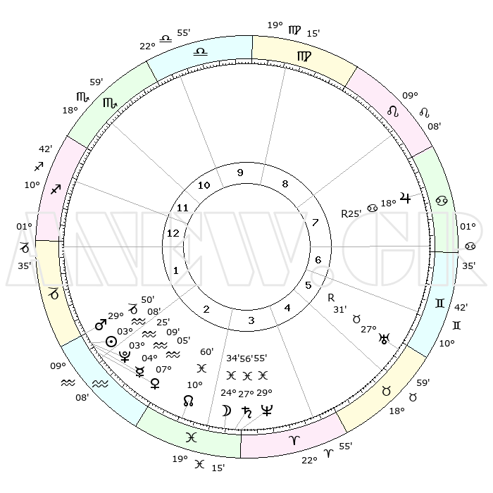 | | ΘΕΣΕΙΣ ΠΛΑΝΗΤΩΝ ΑΣΤΡΟΛΟΓΙΚΟΥ ΧΑΡΤΗ ΤΗΣ ΣΤΙΓΜΗΣ ΑΥΤΗΣ | | | | Πλανήτης | Ζώδιο | Μοίρες | Δεκαήμ. | Σε οίκο | Απόκλιση | | Ακμές των οίκων | | Ηλιος | Υδροχόος | 03°04' | Πρώτο | 2 | 19 S 28 | | 1ος | 08°31' | Τοξότης | | Σελήνη | Ιχθείς | 23°35' | Τρίτο | 3 | 01 S 22 | | 2ος | 10°59' | Αιγόκερως | | Ερμής | Υδροχόος | 04°01' | Πρώτο | 2 | 21 S 16 | | 3ος | 18°07' | Υδροχόος | | Αφροδίτη | Υδροχόος | 06°59' | Πρώτο | 2 | 19 S 40 | | 4ος | 24°09' | Ιχθείς | | Αρης | Αιγόκερως | 29°46' | Τρίτο | 2 | 21 S 11 | | 5ος | 23°60' | Κριός | | Δίας | Καρκίνος | 18°25'R | Δεύτερο | 8 | 22 N 27 | | 6ος | 17°55' | Ταύρος | | Κρόνος | Ιχθείς | 27°55' | Τρίτο | 4 | 02 S 50 | | 7ος | 08°31' | Δίδυμοι | | Ουρανός | Ταύρος | 27°31'R | Τρίτο | 6 | 19 N 25 | | 8ος | 10°58' | Καρκίνος | | Ποσειδώνας | Ιχθείς | 29°55' | Τρίτο | 4 | 01 S 15 | | 9ος | 18°07' | Λέων | | Πλούτωνας | Υδροχόος | 03°25' | Πρώτο | 2 | 23 S 05 | | 10ος | 24°09' | Παρθένος | | Β. Δεσμός | Ιχθείς | 11°00' | Δεύτερο | 3 | 07 S 26 | | 11ος | 23°60' | Ζυγός | | Ωροσκόπος | Τοξότης | 08°31' | Πρώτο | | | 12ος | 17°56' | Σκορπιός | | Μεσουράνημα | Παρθένος | 24°09' | Τρίτο | | | |