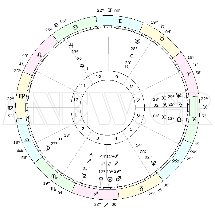 | | ΘΕΣΕΙΣ ΠΛΑΝΗΤΩΝ ΑΣΤΡΟΛΟΓΙΚΟΥ ΧΑΡΤΗ ΤΗΣ ΣΤΙΓΜΗΣ ΑΥΤΗΣ | | | | Πλανήτης | Ζώδιο | Μοίρες | Δεκαήμ. | Σε οίκο | Απόκλιση | | Ακμές των οίκων | | Ηλιος | Τοξότης | 22°50' | Τρίτο | 7 | 23 S 14 | | 1ος | 06°37' | Δίδυμοι | | Σελήνη | Ζυγός | 23°08' | Τρίτο | 5 | 12 S 00 | | 2ος | 00°11' | Καρκίνος | | Ερμής | Τοξότης | 03°23' | Πρώτο | 6 | 19 S 16 | | 3ος | 21°26' | Καρκίνος | | Αφροδίτη | Τοξότης | 17°18' | Δεύτερο | 7 | 22 S 39 | | 4ος | 14°44' | Λέων | | Αρης | Τοξότης | 29°27' | Τρίτο | 7 | 24 S 12 | | 5ος | 14°23' | Παρθένος | | Δίας | Καρκίνος | 23°24'R | Τρίτο | 3 | 21 N 36 | | 6ος | 23°45' | Ζυγός | | Κρόνος | Ιχθείς | 25°31' | Τρίτο | 11 | 03 S 55 | | 7ος | 06°37' | Τοξότης | | Ουρανός | Ταύρος | 28°31'R | Τρίτο | 12 | 19 N 38 | | 8ος | 00°11' | Αιγόκερως | | Ποσειδώνας | Ιχθείς | 29°23' | Τρίτο | 11 | 01 S 29 | | 9ος | 21°26' | Αιγόκερως | | Πλούτωνας | Υδροχόος | 02°14' | Πρώτο | 9 | 23 S 20 | | 10ος | 14°44' | Υδροχόος | | Β. Δεσμός | Ιχθείς | 13°05' | Δεύτερο | 10 | 06 S 39 | | 11ος | 14°23' | Ιχθείς | | Ωροσκόπος | Δίδυμοι | 06°37' | Πρώτο | | | 12ος | 23°45' | Κριός | | Μεσουράνημα | Υδροχόος | 14°44' | Δεύτερο | | | |