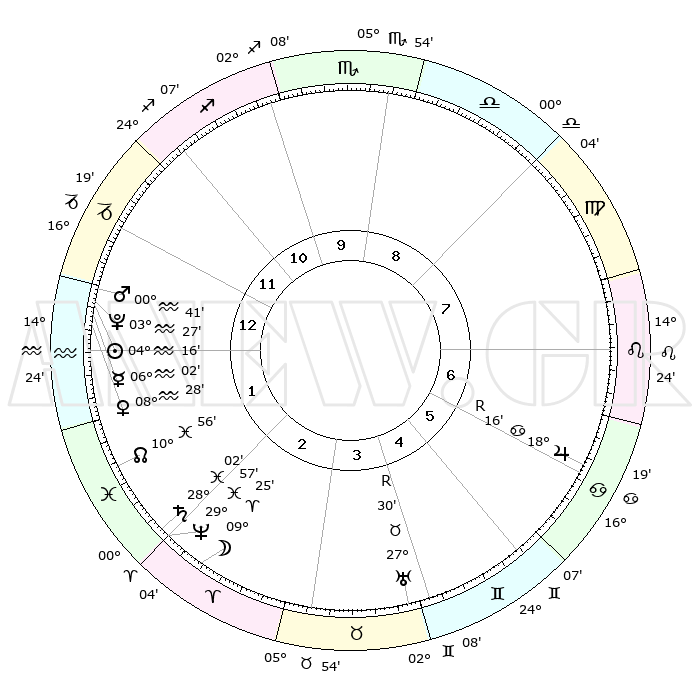 | | ΘΕΣΕΙΣ ΠΛΑΝΗΤΩΝ ΑΣΤΡΟΛΟΓΙΚΟΥ ΧΑΡΤΗ ΤΗΣ ΣΤΙΓΜΗΣ ΑΥΤΗΣ | | | | Πλανήτης | Ζώδιο | Μοίρες | Δεκαήμ. | Σε οίκο | Απόκλιση | | Ακμές των οίκων | | Ηλιος | Υδροχόος | 04°44' | Πρώτο | 6 | 19 S 04 | | 1ος | 25°17' | Λέων | | Σελήνη | Κριός | 15°44' | Δεύτερο | 8 | 09 N 02 | | 2ος | 18°39' | Παρθένος | | Ερμής | Υδροχόος | 06°49' | Πρώτο | 6 | 20 S 35 | | 3ος | 16°52' | Ζυγός | | Αφροδίτη | Υδροχόος | 09°03' | Πρώτο | 6 | 19 S 10 | | 4ος | 19°42' | Σκορπιός | | Αρης | Υδροχόος | 01°03' | Πρώτο | 6 | 20 S 55 | | 5ος | 24°13' | Τοξότης | | Δίας | Καρκίνος | 18°13'R | Δεύτερο | 11 | 22 N 29 | | 6ος | 26°35' | Αιγόκερως | | Κρόνος | Ιχθείς | 28°04' | Τρίτο | 8 | 02 S 47 | | 7ος | 25°17' | Υδροχόος | | Ουρανός | Ταύρος | 27°30'R | Τρίτο | 10 | 19 N 25 | | 8ος | 18°39' | Ιχθείς | | Ποσειδώνας | Ιχθείς | 29°57' | Τρίτο | 8 | 01 S 14 | | 9ος | 16°52' | Κριός | | Πλούτωνας | Υδροχόος | 03°28' | Πρώτο | 6 | 23 S 04 | | 10ος | 19°42' | Ταύρος | | Β. Δεσμός | Ιχθείς | 10°55' | Δεύτερο | 7 | 07 S 28 | | 11ος | 24°13' | Δίδυμοι | | Ωροσκόπος | Λέων | 25°17' | Τρίτο | | | 12ος | 26°35' | Καρκίνος | | Μεσουράνημα | Ταύρος | 19°42' | Δεύτερο | | | |