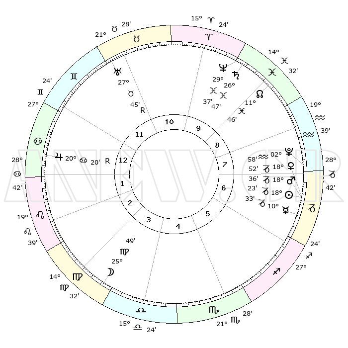 | | ΘΕΣΕΙΣ ΠΛΑΝΗΤΩΝ ΑΣΤΡΟΛΟΓΙΚΟΥ ΧΑΡΤΗ ΤΗΣ ΣΤΙΓΜΗΣ ΑΥΤΗΣ | | | | Πλανήτης | Ζώδιο | Μοίρες | Δεκαήμ. | Σε οίκο | Απόκλιση | | Ακμές των οίκων | | Ηλιος | Αιγόκερως | 17°16' | Δεύτερο | 8 | 22 S 19 | | 1ος | 25°25' | Δίδυμοι | | Σελήνη | Παρθένος | 11°33' | Δεύτερο | 4 | 07 N 08 | | 2ος | 16°32' | Καρκίνος | | Ερμής | Αιγόκερως | 08°49' | Πρώτο | 7 | 24 S 22 | | 3ος | 08°05' | Λέων | | Αφροδίτη | Αιγόκερως | 17°29' | Δεύτερο | 8 | 23 S 01 | | 4ος | 03°41' | Παρθένος | | Αρης | Αιγόκερως | 17°45' | Δεύτερο | 8 | 23 S 11 | | 5ος | 06°51' | Ζυγός | | Δίας | Καρκίνος | 20°29'R | Τρίτο | 2 | 22 N 07 | | 6ος | 17°06' | Σκορπιός | | Κρόνος | Ιχθείς | 26°42' | Τρίτο | 10 | 03 S 22 | | 7ος | 25°25' | Τοξότης | | Ουρανός | Ταύρος | 27°47'R | Τρίτο | 12 | 19 N 28 | | 8ος | 16°32' | Αιγόκερως | | Ποσειδώνας | Ιχθείς | 29°36' | Τρίτο | 10 | 01 S 23 | | 9ος | 08°05' | Υδροχόος | | Πλούτωνας | Υδροχόος | 02°55' | Πρώτο | 8 | 23 S 11 | | 10ος | 03°41' | Ιχθείς | | Β. Δεσμός | Ιχθείς | 11°49' | Δεύτερο | 10 | 07 S 08 | | 11ος | 06°51' | Κριός | | Ωροσκόπος | Δίδυμοι | 25°25' | Τρίτο | | | 12ος | 17°06' | Ταύρος | | Μεσουράνημα | Ιχθείς | 03°41' | Πρώτο | | | |