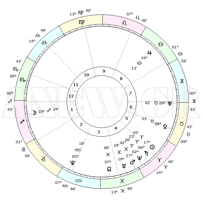 | | ΘΕΣΕΙΣ ΠΛΑΝΗΤΩΝ ΑΣΤΡΟΛΟΓΙΚΟΥ ΧΑΡΤΗ ΤΗΣ ΣΤΙΓΜΗΣ ΑΥΤΗΣ | | | | Πλανήτης | Ζώδιο | Μοίρες | Δεκαήμ. | Σε οίκο | Απόκλιση | | Ακμές των οίκων | | Ηλιος | Κριός | 16°59' | Δεύτερο | 5 | 06 N 40 | | 1ος | 09°57' | Σκορπιός | | Σελήνη | Τοξότης | 09°33' | Πρώτο | 2 | 26 S 59 | | 2ος | 09°02' | Τοξότης | | Ερμής | Ιχθείς | 19°25' | Δεύτερο | 4 | 06 S 05 | | 3ος | 11°55' | Αιγόκερως | | Αφροδίτη | Ταύρος | 08°45' | Πρώτο | 6 | 14 N 14 | | 4ος | 16°49' | Υδροχόος | | Αρης | Ιχθείς | 27°39' | Τρίτο | 5 | 01 S 53 | | 5ος | 19°30' | Ιχθείς | | Δίας | Καρκίνος | 16°12' | Δεύτερο | 9 | 22 N 49 | | 6ος | 17°09' | Κριός | | Κρόνος | Κριός | 06°23' | Πρώτο | 5 | 00 N 34 | | 7ος | 09°57' | Ταύρος | | Ουρανός | Ταύρος | 29°01' | Τρίτο | 7 | 19 N 46 | | 8ος | 09°02' | Δίδυμοι | | Ποσειδώνας | Κριός | 02°26' | Πρώτο | 5 | 00 S 14 | | 9ος | 11°55' | Καρκίνος | | Πλούτωνας | Υδροχόος | 05°18' | Πρώτο | 3 | 22 S 47 | | 10ος | 16°49' | Λέων | | Β. Δεσμός | Ιχθείς | 07°06' | Πρώτο | 4 | 08 S 54 | | 11ος | 19°30' | Παρθένος | | Ωροσκόπος | Σκορπιός | 09°57' | Πρώτο | | | 12ος | 17°09' | Ζυγός | | Μεσουράνημα | Λέων | 16°49' | Δεύτερο | | | |