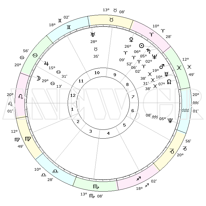 | | ΘΕΣΕΙΣ ΠΛΑΝΗΤΩΝ ΑΣΤΡΟΛΟΓΙΚΟΥ ΧΑΡΤΗ ΤΗΣ ΣΤΙΓΜΗΣ ΑΥΤΗΣ | | | | Πλανήτης | Ζώδιο | Μοίρες | Δεκαήμ. | Σε οίκο | Απόκλιση | | Ακμές των οίκων | | Ηλιος | Κριός | 06°49' | Πρώτο | 9 | 02 N 42 | | 1ος | 04°55' | Λέων | | Σελήνη | Καρκίνος | 28°30' | Τρίτο | 12 | 23 N 46 | | 2ος | 26°19' | Λέων | | Ερμής | Ιχθείς | 10°29' | Δεύτερο | 8 | 08 S 06 | | 3ος | 22°02' | Παρθένος | | Αφροδίτη | Κριός | 26°05' | Τρίτο | 10 | 09 N 29 | | 4ος | 23°38' | Ζυγός | | Αρης | Ιχθείς | 19°35' | Δεύτερο | 8 | 05 S 06 | | 5ος | 29°31' | Σκορπιός | | Δίας | Καρκίνος | 15°31' | Δεύτερο | 12 | 22 N 54 | | 6ος | 04°25' | Αιγόκερως | | Κρόνος | Κριός | 05°06' | Πρώτο | 9 | 00 N 04 | | 7ος | 04°55' | Υδροχόος | | Ουρανός | Ταύρος | 28°34' | Τρίτο | 10 | 19 N 40 | | 8ος | 26°19' | Υδροχόος | | Ποσειδώνας | Κριός | 02°02' | Πρώτο | 9 | 00 S 23 | | 9ος | 22°02' | Ιχθείς | | Πλούτωνας | Υδροχόος | 05°08' | Πρώτο | 7 | 22 S 48 | | 10ος | 23°38' | Κριός | | Β. Δεσμός | Ιχθείς | 07°39' | Πρώτο | 8 | 08 S 42 | | 11ος | 29°31' | Ταύρος | | Ωροσκόπος | Λέων | 04°55' | Πρώτο | | | 12ος | 04°25' | Καρκίνος | | Μεσουράνημα | Κριός | 23°38' | Τρίτο | | | |