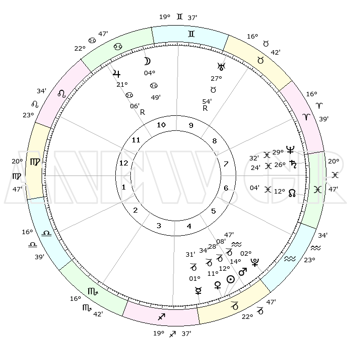 | | ΘΕΣΕΙΣ ΠΛΑΝΗΤΩΝ ΑΣΤΡΟΛΟΓΙΚΟΥ ΧΑΡΤΗ ΤΗΣ ΣΤΙΓΜΗΣ ΑΥΤΗΣ | | | | Πλανήτης | Ζώδιο | Μοίρες | Δεκαήμ. | Σε οίκο | Απόκλιση | | Ακμές των οίκων | | Ηλιος | Αιγόκερως | 12°23' | Δεύτερο | 5 | 22 S 51 | | 1ος | 26°12' | Λέων | | Σελήνη | Καρκίνος | 03°33' | Πρώτο | 11 | 28 N 03 | | 2ος | 19°39' | Παρθένος | | Ερμής | Αιγόκερως | 01°24' | Πρώτο | 5 | 24 S 11 | | 3ος | 17°58' | Ζυγός | | Αφροδίτη | Αιγόκερως | 11°28' | Δεύτερο | 5 | 23 S 30 | | 4ος | 20°49' | Σκορπιός | | Αρης | Αιγόκερως | 14°04' | Δεύτερο | 5 | 23 S 35 | | 5ος | 25°16' | Τοξότης | | Δίας | Καρκίνος | 21°07'R | Τρίτο | 11 | 22 N 01 | | 6ος | 27°33' | Αιγόκερως | | Κρόνος | Ιχθείς | 26°24' | Τρίτο | 8 | 03 S 30 | | 7ος | 26°12' | Υδροχόος | | Ουρανός | Ταύρος | 27°54'R | Τρίτο | 10 | 19 N 30 | | 8ος | 19°39' | Ιχθείς | | Ποσειδώνας | Ιχθείς | 29°32' | Τρίτο | 8 | 01 S 24 | | 9ος | 17°58' | Κριός | | Πλούτωνας | Υδροχόος | 02°47' | Πρώτο | 6 | 23 S 12 | | 10ος | 20°49' | Ταύρος | | Β. Δεσμός | Ιχθείς | 12°04' | Δεύτερο | 7 | 07 S 02 | | 11ος | 25°16' | Δίδυμοι | | Ωροσκόπος | Λέων | 26°12' | Τρίτο | | | 12ος | 27°33' | Καρκίνος | | Μεσουράνημα | Ταύρος | 20°49' | Τρίτο | | | |