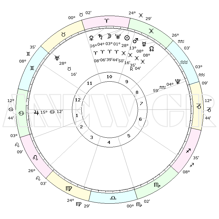 | | ΘΕΣΕΙΣ ΠΛΑΝΗΤΩΝ ΑΣΤΡΟΛΟΓΙΚΟΥ ΧΑΡΤΗ ΤΗΣ ΣΤΙΓΜΗΣ ΑΥΤΗΣ | | | | Πλανήτης | Ζώδιο | Μοίρες | Δεκαήμ. | Σε οίκο | Απόκλιση | | Ακμές των οίκων | | Ηλιος | Ιχθείς | 28°46' | Τρίτο | 10 | 00 S 30 | | 1ος | 20°22' | Δίδυμοι | | Σελήνη | Κριός | 02°42' | Πρώτο | 11 | 03 N 01 | | 2ος | 11°58' | Καρκίνος | | Ερμής | Ιχθείς | 08°36'R | Πρώτο | 10 | 07 S 06 | | 3ος | 03°19' | Λέων | | Αφροδίτη | Κριός | 16°02' | Δεύτερο | 11 | 05 N 28 | | 4ος | 28°12' | Λέων | | Αρης | Ιχθείς | 13°13' | Δεύτερο | 10 | 07 S 36 | | 5ος | 00°27' | Ζυγός | | Δίας | Καρκίνος | 15°12' | Δεύτερο | 2 | 22 N 56 | | 6ος | 10°45' | Σκορπιός | | Κρόνος | Κριός | 04°05' | Πρώτο | 11 | 00 S 20 | | 7ος | 20°22' | Τοξότης | | Ουρανός | Ταύρος | 28°16' | Τρίτο | 12 | 19 N 36 | | 8ος | 11°59' | Αιγόκερως | | Ποσειδώνας | Κριός | 01°44' | Πρώτο | 11 | 00 S 31 | | 9ος | 03°19' | Υδροχόος | | Πλούτωνας | Υδροχόος | 04°59' | Πρώτο | 9 | 22 S 49 | | 10ος | 28°12' | Υδροχόος | | Β. Δεσμός | Ιχθείς | 08°04' | Πρώτο | 10 | 08 S 32 | | 11ος | 00°27' | Κριός | | Ωροσκόπος | Δίδυμοι | 20°22' | Τρίτο | | | 12ος | 10°45' | Ταύρος | | Μεσουράνημα | Υδροχόος | 28°12' | Τρίτο | | | |