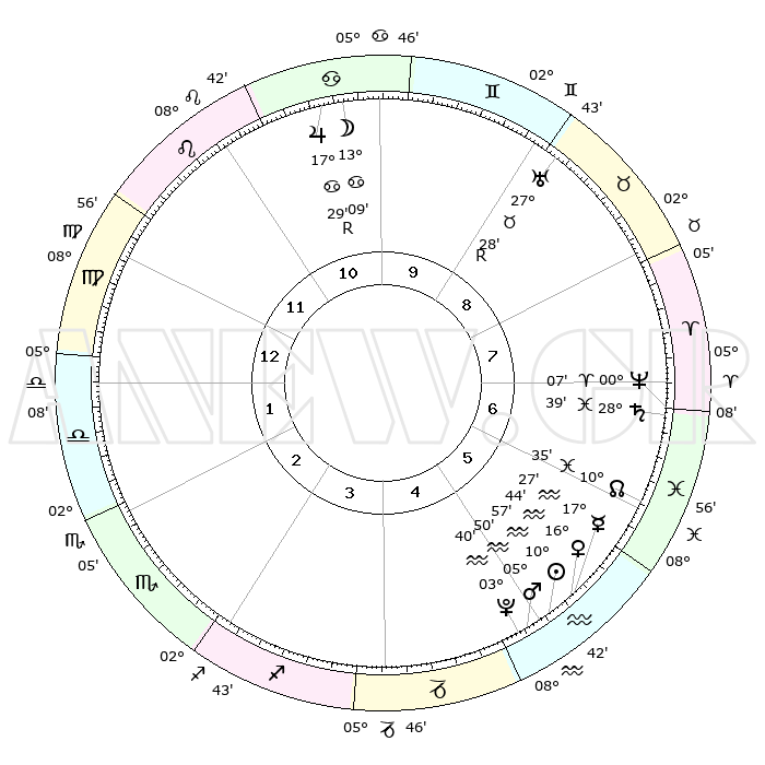 | | ΘΕΣΕΙΣ ΠΛΑΝΗΤΩΝ ΑΣΤΡΟΛΟΓΙΚΟΥ ΧΑΡΤΗ ΤΗΣ ΣΤΙΓΜΗΣ ΑΥΤΗΣ | | | | Πλανήτης | Ζώδιο | Μοίρες | Δεκαήμ. | Σε οίκο | Απόκλιση | | Ακμές των οίκων | | Ηλιος | Υδροχόος | 10°54' | Δεύτερο | 5 | 17 S 30 | | 1ος | 19°59' | Παρθένος | | Σελήνη | Καρκίνος | 12°24' | Δεύτερο | 10 | 27 N 12 | | 2ος | 15°47' | Ζυγός | | Ερμής | Υδροχόος | 17°21' | Δεύτερο | 5 | 17 S 29 | | 3ος | 15°47' | Σκορπιός | | Αφροδίτη | Υδροχόος | 16°40' | Δεύτερο | 5 | 17 S 07 | | 4ος | 18°43' | Τοξότης | | Αρης | Υδροχόος | 05°47' | Πρώτο | 5 | 19 S 50 | | 5ος | 21°54' | Αιγόκερως | | Δίας | Καρκίνος | 17°29'R | Δεύτερο | 10 | 22 N 35 | | 6ος | 22°44' | Υδροχόος | | Κρόνος | Ιχθείς | 28°38' | Τρίτο | 7 | 02 S 32 | | 7ος | 19°59' | Ιχθείς | | Ουρανός | Ταύρος | 27°28'R | Τρίτο | 9 | 19 N 24 | | 8ος | 15°47' | Κριός | | Ποσειδώνας | Κριός | 00°07' | Πρώτο | 7 | 01 S 10 | | 9ος | 15°47' | Ταύρος | | Πλούτωνας | Υδροχόος | 03°40' | Πρώτο | 5 | 23 S 02 | | 10ος | 18°43' | Δίδυμοι | | Β. Δεσμός | Ιχθείς | 10°36' | Δεύτερο | 6 | 07 S 36 | | 11ος | 21°54' | Καρκίνος | | Ωροσκόπος | Παρθένος | 19°59' | Δεύτερο | | | 12ος | 22°44' | Λέων | | Μεσουράνημα | Δίδυμοι | 18°43' | Δεύτερο | | | |