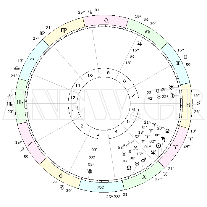 | | ΘΕΣΕΙΣ ΠΛΑΝΗΤΩΝ ΑΣΤΡΟΛΟΓΙΚΟΥ ΧΑΡΤΗ ΤΗΣ ΣΤΙΓΜΗΣ ΑΥΤΗΣ | | | | Πλανήτης | Ζώδιο | Μοίρες | Δεκαήμ. | Σε οίκο | Απόκλιση | | Ακμές των οίκων | | Ηλιος | Κριός | 02°09' | Πρώτο | 6 | 00 N 51 | | 1ος | 25°14' | Ζυγός | | Σελήνη | Ταύρος | 21°39' | Τρίτο | 7 | 23 N 00 | | 2ος | 23°22' | Σκορπιός | | Ερμής | Ιχθείς | 08°41' | Πρώτο | 5 | 07 S 50 | | 3ος | 24°58' | Τοξότης | | Αφροδίτη | Κριός | 20°16' | Τρίτο | 6 | 07 N 11 | | 4ος | 28°51' | Αιγόκερως | | Αρης | Ιχθείς | 15°54' | Δεύτερο | 5 | 06 S 33 | | 5ος | 01°48' | Ιχθείς | | Δίας | Καρκίνος | 15°18' | Δεύτερο | 9 | 22 N 55 | | 6ος | 00°53' | Κριός | | Κρόνος | Κριός | 04°31' | Πρώτο | 6 | 00 S 10 | | 7ος | 25°14' | Κριός | | Ουρανός | Ταύρος | 28°23' | Τρίτο | 8 | 19 N 38 | | 8ος | 23°22' | Ταύρος | | Ποσειδώνας | Κριός | 01°52' | Πρώτο | 6 | 00 S 28 | | 9ος | 24°58' | Δίδυμοι | | Πλούτωνας | Υδροχόος | 05°03' | Πρώτο | 4 | 22 S 48 | | 10ος | 28°51' | Καρκίνος | | Β. Δεσμός | Ιχθείς | 07°54' | Πρώτο | 5 | 08 S 36 | | 11ος | 01°48' | Παρθένος | | Ωροσκόπος | Ζυγός | 25°14' | Τρίτο | | | 12ος | 00°53' | Ζυγός | | Μεσουράνημα | Καρκίνος | 28°51' | Τρίτο | | | |