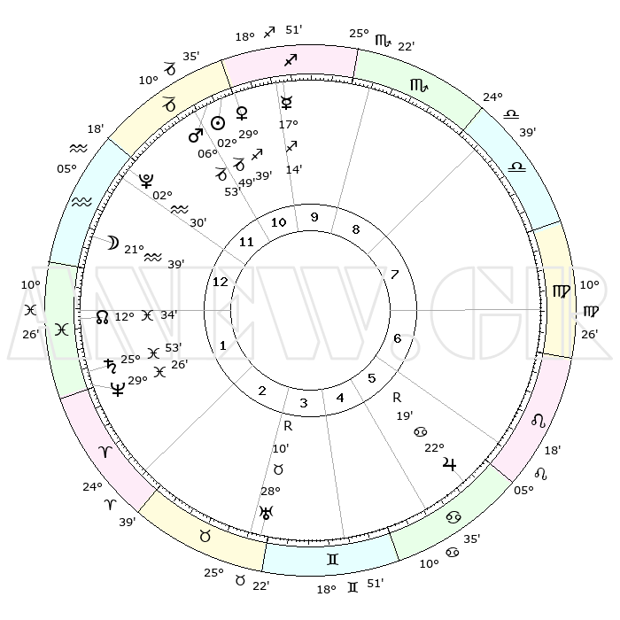 | | ΘΕΣΕΙΣ ΠΛΑΝΗΤΩΝ ΑΣΤΡΟΛΟΓΙΚΟΥ ΧΑΡΤΗ ΤΗΣ ΣΤΙΓΜΗΣ ΑΥΤΗΣ | | | | Πλανήτης | Ζώδιο | Μοίρες | Δεκαήμ. | Σε οίκο | Απόκλιση | | Ακμές των οίκων | | Ηλιος | Αιγόκερως | 02°35' | Πρώτο | 1 | 23 S 24 | | 1ος | 06°28' | Τοξότης | | Σελήνη | Υδροχόος | 18°39' | Δεύτερο | 3 | 17 S 05 | | 2ος | 08°34' | Αιγόκερως | | Ερμής | Τοξότης | 16°53' | Δεύτερο | 1 | 22 S 26 | | 3ος | 15°22' | Υδροχόος | | Αφροδίτη | Τοξότης | 29°21' | Τρίτο | 1 | 23 S 38 | | 4ος | 21°27' | Ιχθείς | | Αρης | Αιγόκερως | 06°42' | Πρώτο | 1 | 24 S 06 | | 5ος | 21°36' | Κριός | | Δίας | Καρκίνος | 22°21'R | Τρίτο | 8 | 21 N 48 | | 6ος | 15°47' | Ταύρος | | Κρόνος | Ιχθείς | 25°53' | Τρίτο | 4 | 03 S 44 | | 7ος | 06°28' | Δίδυμοι | | Ουρανός | Ταύρος | 28°11'R | Τρίτο | 6 | 19 N 33 | | 8ος | 08°34' | Καρκίνος | | Ποσειδώνας | Ιχθείς | 29°26' | Τρίτο | 4 | 01 S 27 | | 9ος | 15°22' | Λέων | | Πλούτωνας | Υδροχόος | 02°30' | Πρώτο | 2 | 23 S 16 | | 10ος | 21°27' | Παρθένος | | Β. Δεσμός | Ιχθείς | 12°35' | Δεύτερο | 3 | 06 S 50 | | 11ος | 21°36' | Ζυγός | | Ωροσκόπος | Τοξότης | 06°28' | Πρώτο | | | 12ος | 15°47' | Σκορπιός | | Μεσουράνημα | Παρθένος | 21°27' | Τρίτο | | | |