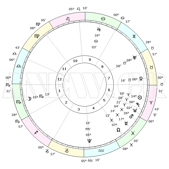 | | ΘΕΣΕΙΣ ΠΛΑΝΗΤΩΝ ΑΣΤΡΟΛΟΓΙΚΟΥ ΧΑΡΤΗ ΤΗΣ ΣΤΙΓΜΗΣ ΑΥΤΗΣ | | | | Πλανήτης | Ζώδιο | Μοίρες | Δεκαήμ. | Σε οίκο | Απόκλιση | | Ακμές των οίκων | | Ηλιος | Κριός | 14°53' | Δεύτερο | 7 | 05 N 52 | | 1ος | 29°19' | Παρθένος | | Σελήνη | Σκορπιός | 13°56' | Δεύτερο | 2 | 20 S 30 | | 2ος | 25°52' | Ζυγός | | Ερμής | Ιχθείς | 17°07' | Δεύτερο | 6 | 06 S 45 | | 3ος | 26°16' | Σκορπιός | | Αφροδίτη | Ταύρος | 06°08' | Πρώτο | 8 | 13 N 17 | | 4ος | 29°15' | Τοξότης | | Αρης | Ιχθείς | 25°59' | Τρίτο | 6 | 02 S 33 | | 5ος | 02°14' | Υδροχόος | | Δίας | Καρκίνος | 16°02' | Δεύτερο | 10 | 22 N 50 | | 6ος | 02°41' | Ιχθείς | | Κρόνος | Κριός | 06°07' | Πρώτο | 7 | 00 N 28 | | 7ος | 29°19' | Ιχθείς | | Ουρανός | Ταύρος | 28°56' | Τρίτο | 9 | 19 N 45 | | 8ος | 25°52' | Κριός | | Ποσειδώνας | Κριός | 02°21' | Πρώτο | 7 | 00 S 16 | | 9ος | 26°16' | Ταύρος | | Πλούτωνας | Υδροχόος | 05°16' | Πρώτο | 5 | 22 S 47 | | 10ος | 29°15' | Δίδυμοι | | Β. Δεσμός | Ιχθείς | 07°13' | Πρώτο | 6 | 08 S 52 | | 11ος | 02°14' | Λέων | | Ωροσκόπος | Παρθένος | 29°19' | Τρίτο | | | 12ος | 02°41' | Παρθένος | | Μεσουράνημα | Δίδυμοι | 29°15' | Τρίτο | | | |