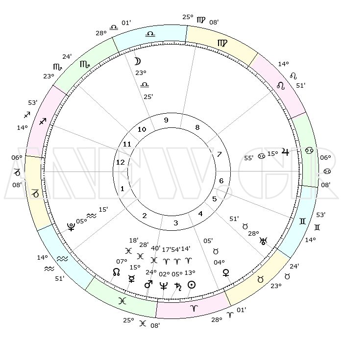| | ΘΕΣΕΙΣ ΠΛΑΝΗΤΩΝ ΑΣΤΡΟΛΟΓΙΚΟΥ ΧΑΡΤΗ ΤΗΣ ΣΤΙΓΜΗΣ ΑΥΤΗΣ | | | | Πλανήτης | Ζώδιο | Μοίρες | Δεκαήμ. | Σε οίκο | Απόκλιση | | Ακμές των οίκων | | Ηλιος | Κριός | 13°10' | Δεύτερο | 4 | 05 N 12 | | 1ος | 14°13' | Τοξότης | | Σελήνη | Ζυγός | 22°34' | Τρίτο | 10 | 12 S 07 | | 2ος | 17°44' | Αιγόκερως | | Ερμής | Ιχθείς | 15°24' | Δεύτερο | 3 | 07 S 13 | | 3ος | 25°49' | Υδροχόος | | Αφροδίτη | Ταύρος | 03°60' | Πρώτο | 5 | 12 N 30 | | 4ος | 01°35' | Κριός | | Αρης | Ιχθείς | 24°37' | Τρίτο | 3 | 03 S 05 | | 5ος | 00°32' | Ταύρος | | Δίας | Καρκίνος | 15°55' | Δεύτερο | 7 | 22 N 51 | | 6ος | 23°46' | Ταύρος | | Κρόνος | Κριός | 05°54' | Πρώτο | 4 | 00 N 23 | | 7ος | 14°13' | Δίδυμοι | | Ουρανός | Ταύρος | 28°51' | Τρίτο | 6 | 19 N 44 | | 8ος | 17°44' | Καρκίνος | | Ποσειδώνας | Κριός | 02°17' | Πρώτο | 4 | 00 S 18 | | 9ος | 25°49' | Λέων | | Πλούτωνας | Υδροχόος | 05°15' | Πρώτο | 2 | 22 S 47 | | 10ος | 01°35' | Ζυγός | | Β. Δεσμός | Ιχθείς | 07°18' | Πρώτο | 3 | 08 S 50 | | 11ος | 00°32' | Σκορπιός | | Ωροσκόπος | Τοξότης | 14°13' | Δεύτερο | | | 12ος | 23°46' | Σκορπιός | | Μεσουράνημα | Ζυγός | 01°35' | Πρώτο | | | |