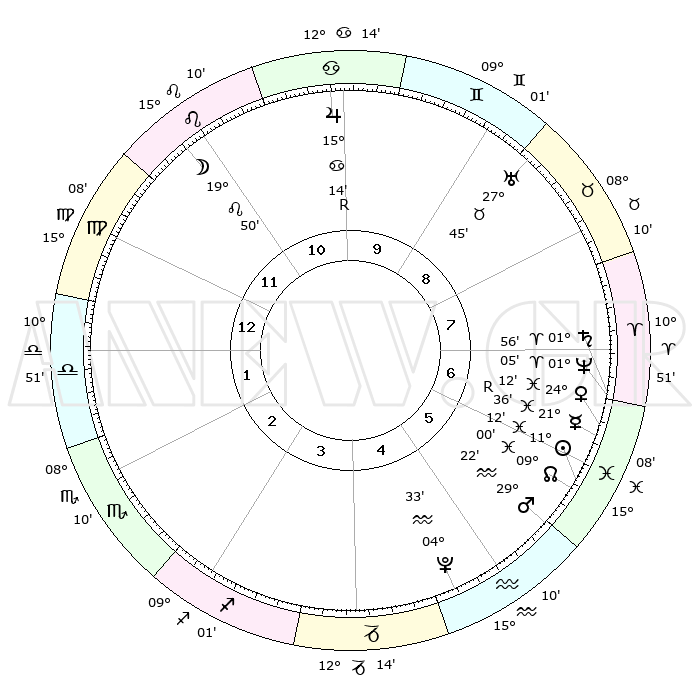 | | ΘΕΣΕΙΣ ΠΛΑΝΗΤΩΝ ΑΣΤΡΟΛΟΓΙΚΟΥ ΧΑΡΤΗ ΤΗΣ ΣΤΙΓΜΗΣ ΑΥΤΗΣ | | | | Πλανήτης | Ζώδιο | Μοίρες | Δεκαήμ. | Σε οίκο | Απόκλιση | | Ακμές των οίκων | | Ηλιος | Ιχθείς | 11°08' | Δεύτερο | 6 | 07 S 23 | | 1ος | 24°04' | Παρθένος | | Σελήνη | Λέων | 19°03' | Δεύτερο | 11 | 16 N 49 | | 2ος | 20°12' | Ζυγός | | Ερμής | Ιχθείς | 21°38'R | Τρίτο | 6 | 00 S 11 | | 3ος | 20°24' | Σκορπιός | | Αφροδίτη | Ιχθείς | 24°07' | Τρίτο | 7 | 03 S 34 | | 4ος | 23°20' | Τοξότης | | Αρης | Υδροχόος | 29°19' | Τρίτο | 6 | 12 S 44 | | 5ος | 26°24' | Αιγόκερως | | Δίας | Καρκίνος | 15°14'R | Δεύτερο | 10 | 22 N 54 | | 6ος | 27°04' | Υδροχόος | | Κρόνος | Κριός | 01°56' | Πρώτο | 7 | 01 S 11 | | 7ος | 24°04' | Ιχθείς | | Ουρανός | Ταύρος | 27°45' | Τρίτο | 9 | 19 N 29 | | 8ος | 20°12' | Κριός | | Ποσειδώνας | Κριός | 01°05' | Πρώτο | 7 | 00 S 46 | | 9ος | 20°24' | Ταύρος | | Πλούτωνας | Υδροχόος | 04°33' | Πρώτο | 5 | 22 S 52 | | 10ος | 23°20' | Δίδυμοι | | Β. Δεσμός | Ιχθείς | 09°00' | Πρώτο | 6 | 08 S 11 | | 11ος | 26°24' | Καρκίνος | | Ωροσκόπος | Παρθένος | 24°04' | Τρίτο | | | 12ος | 27°04' | Λέων | | Μεσουράνημα | Δίδυμοι | 23°20' | Τρίτο | | | |