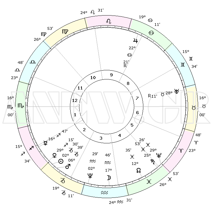 | | ΘΕΣΕΙΣ ΠΛΑΝΗΤΩΝ ΑΣΤΡΟΛΟΓΙΚΟΥ ΧΑΡΤΗ ΤΗΣ ΣΤΙΓΜΗΣ ΑΥΤΗΣ | | | | Πλανήτης | Ζώδιο | Μοίρες | Δεκαήμ. | Σε οίκο | Απόκλιση | | Ακμές των οίκων | | Ηλιος | Αιγόκερως | 02°25' | Πρώτο | 3 | 23 S 25 | | 1ος | 22°48' | Ζυγός | | Σελήνη | Υδροχόος | 16°46' | Δεύτερο | 4 | 17 S 49 | | 2ος | 20°48' | Σκορπιός | | Ερμής | Τοξότης | 16°40' | Δεύτερο | 2 | 22 S 23 | | 3ος | 22°15' | Τοξότης | | Αφροδίτη | Τοξότης | 29°09' | Τρίτο | 3 | 23 S 38 | | 4ος | 25°60' | Αιγόκερως | | Αρης | Αιγόκερως | 06°36' | Πρώτο | 3 | 24 S 06 | | 5ος | 28°57' | Υδροχόος | | Δίας | Καρκίνος | 22°22'R | Τρίτο | 9 | 21 N 48 | | 6ος | 28°13' | Ιχθείς | | Κρόνος | Ιχθείς | 25°52' | Τρίτο | 5 | 03 S 44 | | 7ος | 22°48' | Κριός | | Ουρανός | Ταύρος | 28°11'R | Τρίτο | 8 | 19 N 33 | | 8ος | 20°48' | Ταύρος | | Ποσειδώνας | Ιχθείς | 29°26' | Τρίτο | 6 | 01 S 27 | | 9ος | 22°15' | Δίδυμοι | | Πλούτωνας | Υδροχόος | 02°29' | Πρώτο | 4 | 23 S 16 | | 10ος | 25°60' | Καρκίνος | | Β. Δεσμός | Ιχθείς | 12°36' | Δεύτερο | 5 | 06 S 50 | | 11ος | 28°57' | Λέων | | Ωροσκόπος | Ζυγός | 22°48' | Τρίτο | | | 12ος | 28°13' | Παρθένος | | Μεσουράνημα | Καρκίνος | 25°60' | Τρίτο | | | |