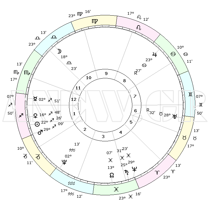 | | ΘΕΣΕΙΣ ΠΛΑΝΗΤΩΝ ΑΣΤΡΟΛΟΓΙΚΟΥ ΧΑΡΤΗ ΤΗΣ ΣΤΙΓΜΗΣ ΑΥΤΗΣ | | | | Πλανήτης | Ζώδιο | Μοίρες | Δεκαήμ. | Σε οίκο | Απόκλιση | | Ακμές των οίκων | | Ηλιος | Τοξότης | 22°12' | Τρίτο | 3 | 23 S 12 | | 1ος | 03°21' | Ζυγός | | Σελήνη | Ζυγός | 15°44' | Δεύτερο | 1 | 08 S 42 | | 2ος | 00°10' | Σκορπιός | | Ερμής | Τοξότης | 02°34' | Πρώτο | 3 | 19 S 02 | | 3ος | 00°44' | Τοξότης | | Αφροδίτη | Τοξότης | 16°31' | Δεύτερο | 3 | 22 S 33 | | 4ος | 03°46' | Αιγόκερως | | Αρης | Τοξότης | 28°60' | Τρίτο | 3 | 24 S 12 | | 5ος | 06°42' | Υδροχόος | | Δίας | Καρκίνος | 23°28'R | Τρίτο | 10 | 21 N 35 | | 6ος | 07°01' | Ιχθείς | | Κρόνος | Ιχθείς | 25°30' | Τρίτο | 6 | 03 S 55 | | 7ος | 03°21' | Κριός | | Ουρανός | Ταύρος | 28°32'R | Τρίτο | 8 | 19 N 38 | | 8ος | 00°10' | Ταύρος | | Ποσειδώνας | Ιχθείς | 29°23' | Τρίτο | 6 | 01 S 29 | | 9ος | 00°44' | Δίδυμοι | | Πλούτωνας | Υδροχόος | 02°13' | Πρώτο | 4 | 23 S 20 | | 10ος | 03°46' | Καρκίνος | | Β. Δεσμός | Ιχθείς | 13°07' | Δεύτερο | 6 | 06 S 38 | | 11ος | 06°42' | Λέων | | Ωροσκόπος | Ζυγός | 03°21' | Πρώτο | | | 12ος | 07°01' | Παρθένος | | Μεσουράνημα | Καρκίνος | 03°46' | Πρώτο | | | |