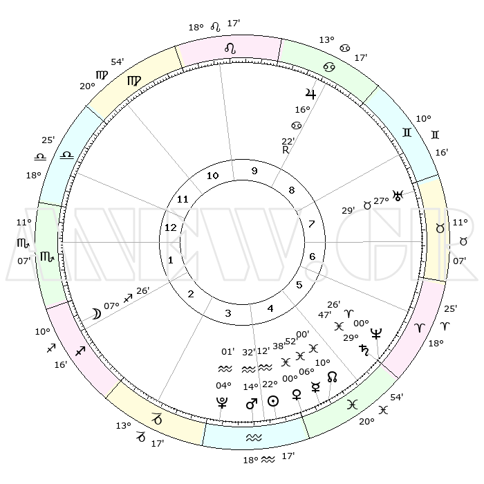 | | ΘΕΣΕΙΣ ΠΛΑΝΗΤΩΝ ΑΣΤΡΟΛΟΓΙΚΟΥ ΧΑΡΤΗ ΤΗΣ ΣΤΙΓΜΗΣ ΑΥΤΗΣ | | | | Πλανήτης | Ζώδιο | Μοίρες | Δεκαήμ. | Σε οίκο | Απόκλιση | | Ακμές των οίκων | | Ηλιος | Υδροχόος | 22°09' | Τρίτο | 4 | 14 S 08 | | 1ος | 25°22' | Ζυγός | | Σελήνη | Τοξότης | 06°48' | Πρώτο | 2 | 26 S 37 | | 2ος | 23°31' | Σκορπιός | | Ερμής | Ιχθείς | 06°46' | Πρώτο | 5 | 09 S 44 | | 3ος | 25°08' | Τοξότης | | Αφροδίτη | Ιχθείς | 00°34' | Πρώτο | 4 | 12 S 38 | | 4ος | 29°01' | Αιγόκερως | | Αρης | Υδροχόος | 14°29' | Δεύτερο | 4 | 17 S 30 | | 5ος | 01°58' | Ιχθείς | | Δίας | Καρκίνος | 16°22'R | Δεύτερο | 9 | 22 N 45 | | 6ος | 01°02' | Κριός | | Κρόνος | Ιχθείς | 29°46' | Τρίτο | 5 | 02 S 04 | | 7ος | 25°22' | Κριός | | Ουρανός | Ταύρος | 27°29' | Τρίτο | 8 | 19 N 25 | | 8ος | 23°31' | Ταύρος | | Ποσειδώνας | Κριός | 00°26' | Πρώτο | 5 | 01 S 02 | | 9ος | 25°08' | Δίδυμοι | | Πλούτωνας | Υδροχόος | 04°01' | Πρώτο | 4 | 22 S 58 | | 10ος | 29°02' | Καρκίνος | | Β. Δεσμός | Ιχθείς | 10°00' | Δεύτερο | 5 | 07 S 49 | | 11ος | 01°58' | Παρθένος | | Ωροσκόπος | Ζυγός | 25°22' | Τρίτο | | | 12ος | 01°02' | Ζυγός | | Μεσουράνημα | Καρκίνος | 29°02' | Τρίτο | | | |