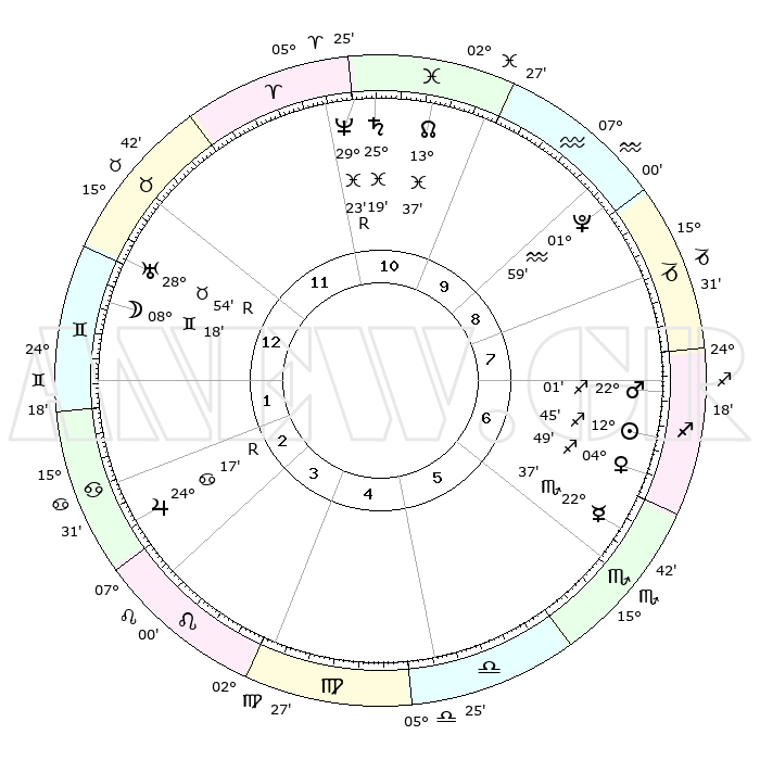 | | ΘΕΣΕΙΣ ΠΛΑΝΗΤΩΝ ΑΣΤΡΟΛΟΓΙΚΟΥ ΧΑΡΤΗ ΤΗΣ ΣΤΙΓΜΗΣ ΑΥΤΗΣ | | | | Πλανήτης | Ζώδιο | Μοίρες | Δεκαήμ. | Σε οίκο | Απόκλιση | | Ακμές των οίκων | | Ηλιος | Τοξότης | 12°43' | Δεύτερο | 6 | 22 S 19 | | 1ος | 15°06' | Δίδυμοι | | Σελήνη | Δίδυμοι | 07°54' | Πρώτο | 12 | 26 N 31 | | 2ος | 07°21' | Καρκίνος | | Ερμής | Σκορπιός | 22°36' | Τρίτο | 6 | 15 S 57 | | 3ος | 28°35' | Καρκίνος | | Αφροδίτη | Τοξότης | 04°47' | Πρώτο | 6 | 20 S 31 | | 4ος | 22°48' | Λέων | | Αρης | Τοξότης | 22°00' | Τρίτο | 7 | 23 S 53 | | 5ος | 24°03' | Παρθένος | | Δίας | Καρκίνος | 24°17'R | Τρίτο | 2 | 21 N 25 | | 6ος | 04°10' | Σκορπιός | | Κρόνος | Ιχθείς | 25°19' | Τρίτο | 11 | 04 S 01 | | 7ος | 15°06' | Τοξότης | | Ουρανός | Ταύρος | 28°54'R | Τρίτο | 12 | 19 N 42 | | 8ος | 07°21' | Αιγόκερως | | Ποσειδώνας | Ιχθείς | 29°23'R | Τρίτο | 11 | 01 S 29 | | 9ος | 28°35' | Αιγόκερως | | Πλούτωνας | Υδροχόος | 01°59' | Πρώτο | 9 | 23 S 23 | | 10ος | 22°48' | Υδροχόος | | Β. Δεσμός | Ιχθείς | 13°37' | Δεύτερο | 10 | 06 S 26 | | 11ος | 24°03' | Ιχθείς | | Ωροσκόπος | Δίδυμοι | 15°06' | Δεύτερο | | | 12ος | 04°10' | Ταύρος | | Μεσουράνημα | Υδροχόος | 22°48' | Τρίτο | | | |