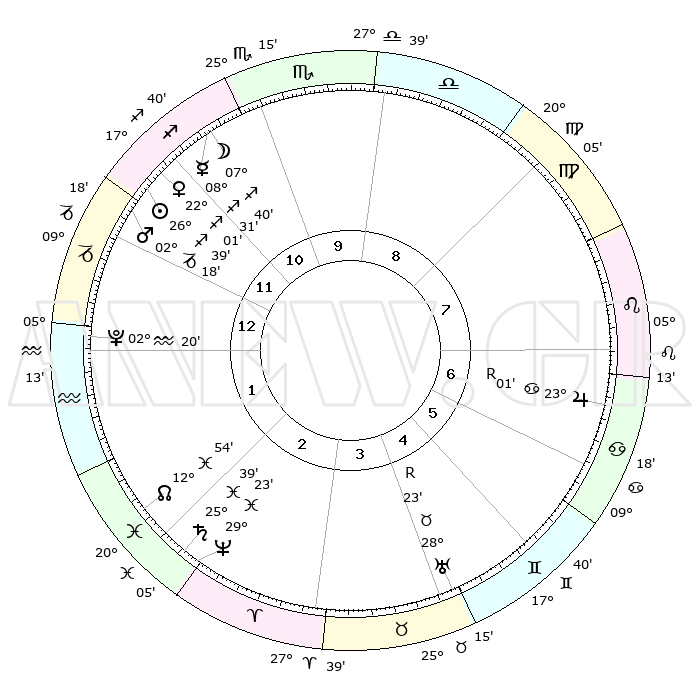 | | ΘΕΣΕΙΣ ΠΛΑΝΗΤΩΝ ΑΣΤΡΟΛΟΓΙΚΟΥ ΧΑΡΤΗ ΤΗΣ ΣΤΙΓΜΗΣ ΑΥΤΗΣ | | | | Πλανήτης | Ζώδιο | Μοίρες | Δεκαήμ. | Σε οίκο | Απόκλιση | | Ακμές των οίκων | | Ηλιος | Τοξότης | 26°20' | Τρίτο | 3 | 23 S 23 | | 1ος | 25°56' | Ζυγός | | Σελήνη | Τοξότης | 04°00' | Πρώτο | 2 | 25 S 48 | | 2ος | 24°06' | Σκορπιός | | Ερμής | Τοξότης | 08°05' | Πρώτο | 2 | 20 S 31 | | 3ος | 25°46' | Τοξότης | | Αφροδίτη | Τοξότης | 21°38' | Τρίτο | 2 | 23 S 08 | | 4ος | 29°41' | Αιγόκερως | | Αρης | Αιγόκερως | 02°04' | Πρώτο | 3 | 24 S 13 | | 5ος | 02°38' | Ιχθείς | | Δίας | Καρκίνος | 23°03'R | Τρίτο | 9 | 21 N 40 | | 6ος | 01°39' | Κριός | | Κρόνος | Ιχθείς | 25°38' | Τρίτο | 5 | 03 S 51 | | 7ος | 25°56' | Κριός | | Ουρανός | Ταύρος | 28°23'R | Τρίτο | 8 | 19 N 36 | | 8ος | 24°06' | Ταύρος | | Ποσειδώνας | Ιχθείς | 29°23' | Τρίτο | 5 | 01 S 28 | | 9ος | 25°46' | Δίδυμοι | | Πλούτωνας | Υδροχόος | 02°19' | Πρώτο | 4 | 23 S 18 | | 10ος | 29°41' | Καρκίνος | | Β. Δεσμός | Ιχθείς | 12°55' | Δεύτερο | 5 | 06 S 43 | | 11ος | 02°38' | Παρθένος | | Ωροσκόπος | Ζυγός | 25°56' | Τρίτο | | | 12ος | 01°39' | Ζυγός | | Μεσουράνημα | Καρκίνος | 29°41' | Τρίτο | | | |
