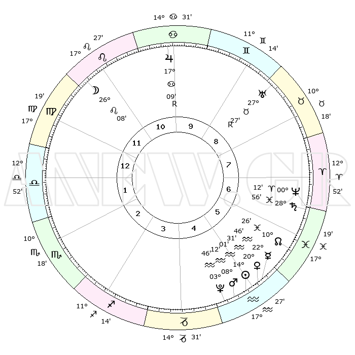 | | ΘΕΣΕΙΣ ΠΛΑΝΗΤΩΝ ΑΣΤΡΟΛΟΓΙΚΟΥ ΧΑΡΤΗ ΤΗΣ ΣΤΙΓΜΗΣ ΑΥΤΗΣ | | | | Πλανήτης | Ζώδιο | Μοίρες | Δεκαήμ. | Σε οίκο | Απόκλιση | | Ακμές των οίκων | | Ηλιος | Υδροχόος | 13°57' | Δεύτερο | 5 | 16 S 38 | | 1ος | 24°14' | Παρθένος | | Σελήνη | Λέων | 25°15' | Τρίτο | 11 | 14 N 17 | | 2ος | 20°23' | Ζυγός | | Ερμής | Υδροχόος | 22°40' | Τρίτο | 5 | 15 S 37 | | 3ος | 20°35' | Σκορπιός | | Αφροδίτη | Υδροχόος | 20°26' | Τρίτο | 5 | 15 S 59 | | 4ος | 23°31' | Τοξότης | | Αρης | Υδροχόος | 08°09' | Πρώτο | 5 | 19 S 14 | | 5ος | 26°36' | Αιγόκερως | | Δίας | Καρκίνος | 17°10'R | Δεύτερο | 10 | 22 N 38 | | 6ος | 27°15' | Υδροχόος | | Κρόνος | Ιχθείς | 28°56' | Τρίτο | 7 | 02 S 25 | | 7ος | 24°14' | Ιχθείς | | Ουρανός | Ταύρος | 27°27'R | Τρίτο | 9 | 19 N 24 | | 8ος | 20°23' | Κριός | | Ποσειδώνας | Κριός | 00°12' | Πρώτο | 7 | 01 S 08 | | 9ος | 20°35' | Ταύρος | | Πλούτωνας | Υδροχόος | 03°45' | Πρώτο | 5 | 23 S 01 | | 10ος | 23°31' | Δίδυμοι | | Β. Δεσμός | Ιχθείς | 10°26' | Δεύτερο | 6 | 07 S 39 | | 11ος | 26°36' | Καρκίνος | | Ωροσκόπος | Παρθένος | 24°14' | Τρίτο | | | 12ος | 27°15' | Λέων | | Μεσουράνημα | Δίδυμοι | 23°31' | Τρίτο | | | |
