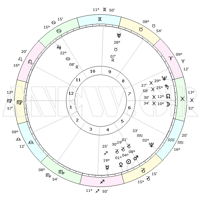 | | ΘΕΣΕΙΣ ΠΛΑΝΗΤΩΝ ΑΣΤΡΟΛΟΓΙΚΟΥ ΧΑΡΤΗ ΤΗΣ ΣΤΙΓΜΗΣ ΑΥΤΗΣ | | | | Πλανήτης | Ζώδιο | Μοίρες | Δεκαήμ. | Σε οίκο | Απόκλιση | | Ακμές των οίκων | | Ηλιος | Αιγόκερως | 04°14' | Πρώτο | 5 | 23 S 22 | | 1ος | 20°40' | Λέων | | Σελήνη | Ιχθείς | 09°32' | Πρώτο | 7 | 08 S 08 | | 2ος | 13°33' | Παρθένος | | Ερμής | Τοξότης | 19°18' | Δεύτερο | 5 | 22 S 51 | | 3ος | 11°16' | Ζυγός | | Αφροδίτη | Αιγόκερως | 01°24' | Πρώτο | 5 | 23 S 42 | | 4ος | 13°57' | Σκορπιός | | Αρης | Αιγόκερως | 07°57' | Πρώτο | 5 | 24 S 03 | | 5ος | 18°49' | Τοξότης | | Δίας | Καρκίνος | 22°09'R | Τρίτο | 12 | 21 N 50 | | 6ος | 21°38' | Αιγόκερως | | Κρόνος | Ιχθείς | 25°57' | Τρίτο | 8 | 03 S 42 | | 7ος | 20°40' | Υδροχόος | | Ουρανός | Ταύρος | 28°08'R | Τρίτο | 10 | 19 N 33 | | 8ος | 13°33' | Ιχθείς | | Ποσειδώνας | Ιχθείς | 29°27' | Τρίτο | 8 | 01 S 27 | | 9ος | 11°16' | Κριός | | Πλούτωνας | Υδροχόος | 02°32' | Πρώτο | 6 | 23 S 15 | | 10ος | 13°57' | Ταύρος | | Β. Δεσμός | Ιχθείς | 12°30' | Δεύτερο | 7 | 06 S 52 | | 11ος | 18°49' | Δίδυμοι | | Ωροσκόπος | Λέων | 20°40' | Τρίτο | | | 12ος | 21°38' | Καρκίνος | | Μεσουράνημα | Ταύρος | 13°57' | Δεύτερο | | | |